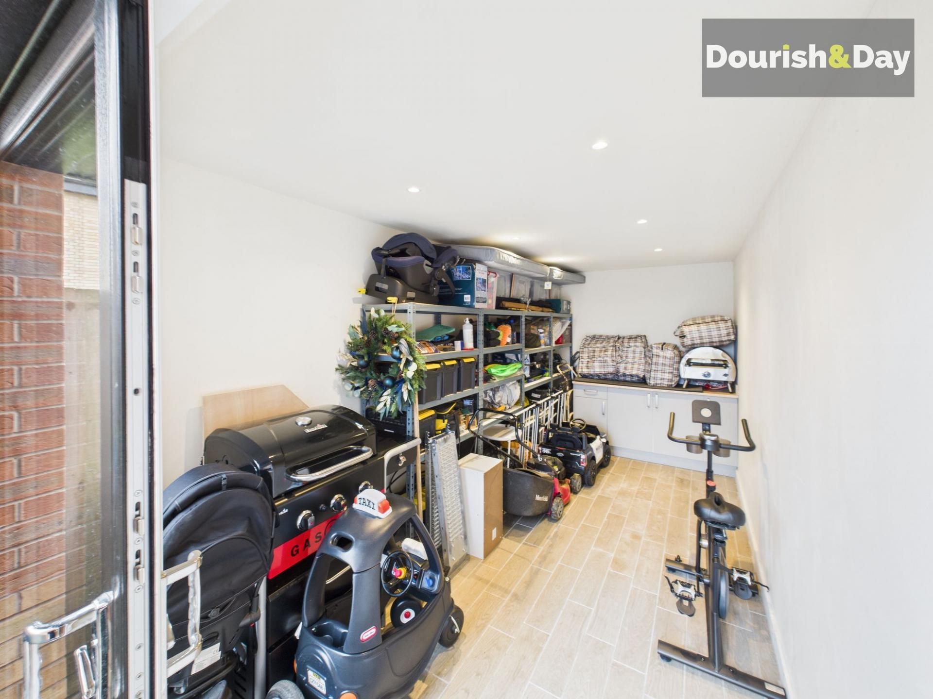 Set back behind a lawned front garden, the house is approached via a driveway to the left leading to a detached single garage. The garage itself has been cleverly upgraded, now fitted with sliding glass doors to the front, flooring laid and counter units added, making it an ideal home gym, workshop, studio or entertaining space, while still retaining its practical versatility.