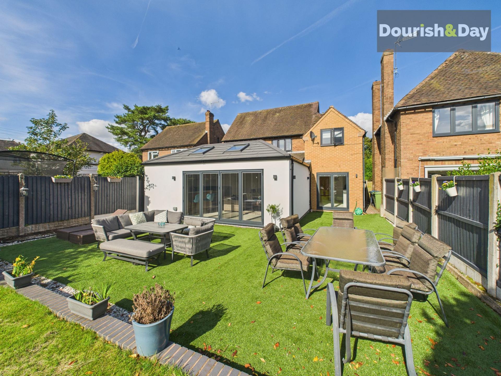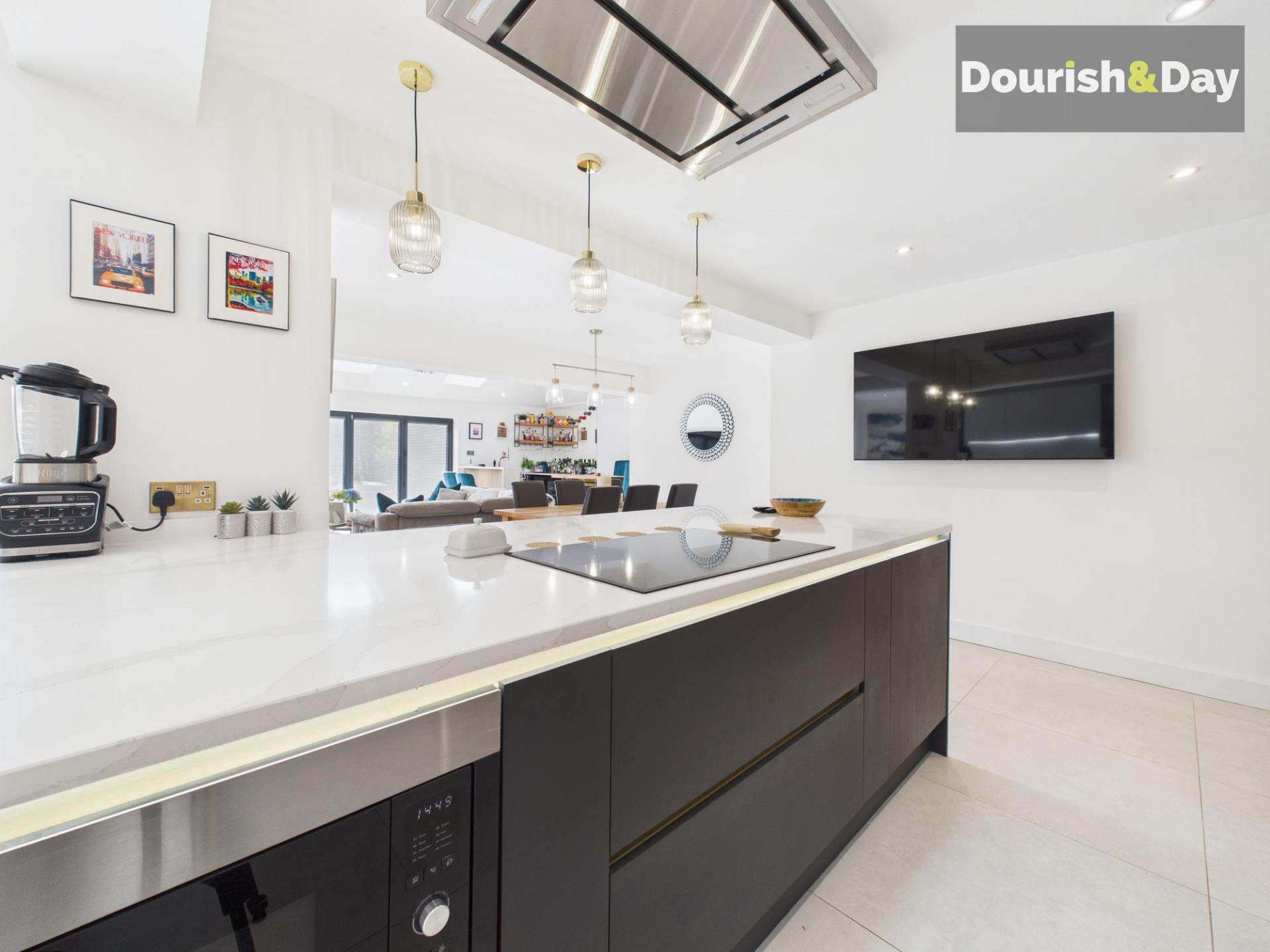 Inside, the home is finished to an exceptional standard. The welcoming entrance hallway leads to a useful guest WC, a bright front living room, and a versatile office/study – perfect for those working from home. The real highlight is the extended open-plan kitchen, living, and dining space – a breathtaking hub designed for both entertaining and everyday family life. With a stylish home bar, sleek modern fittings, and impressive bi-fold with integrated magnetic blinds that open directly into the garden, this space is made for wow-factor living. Comfort is further enhanced with underfloor heating on its own thermostat, extending into the separate utility room. Upstairs, there are four generous double bedrooms. The main bedroom boasts a walk-in wardrobe and a luxurious en-suite shower room, while the second bedroom also enjoys its own en-suite. A contemporary family bathroom completes the first floor.