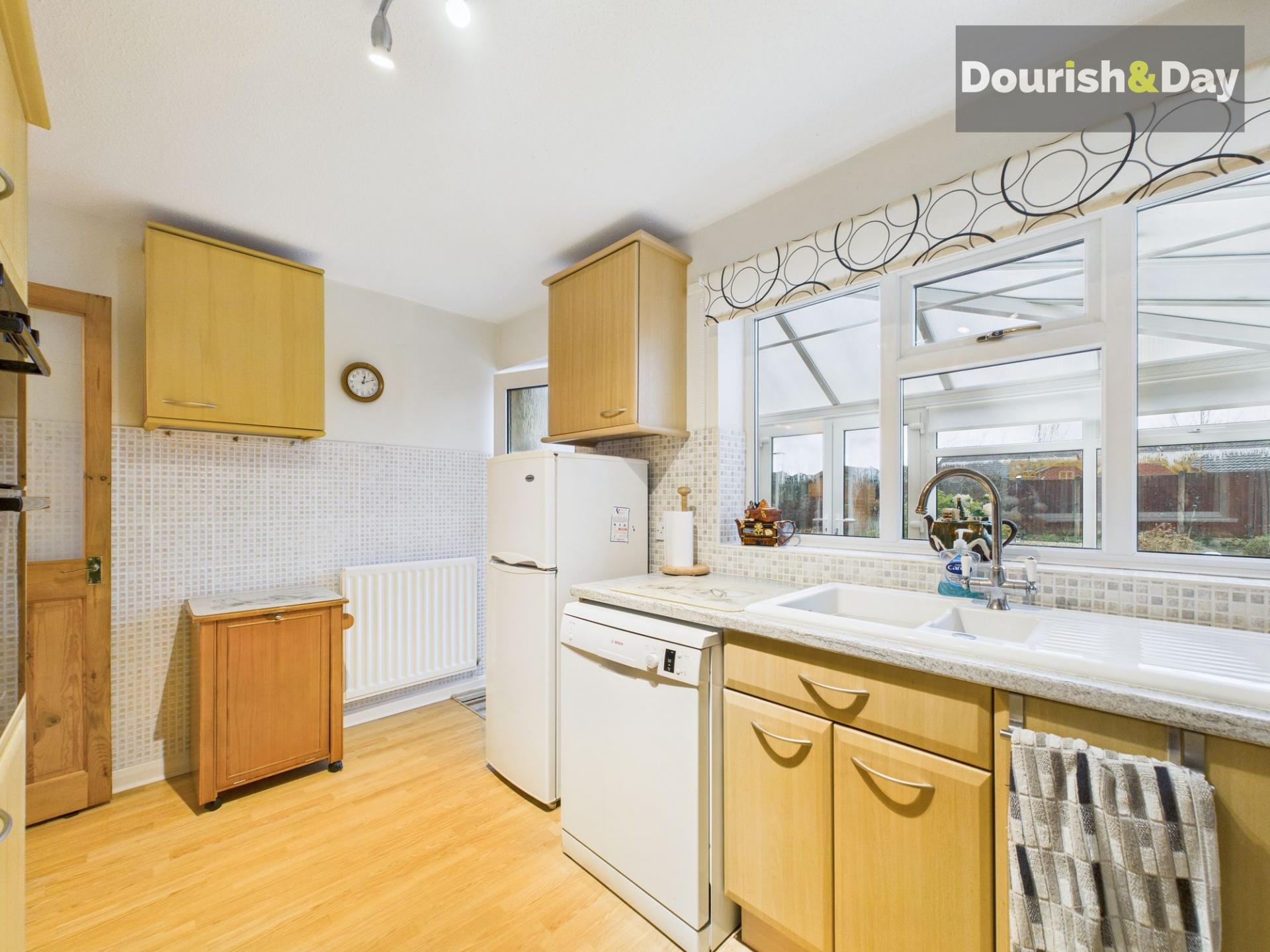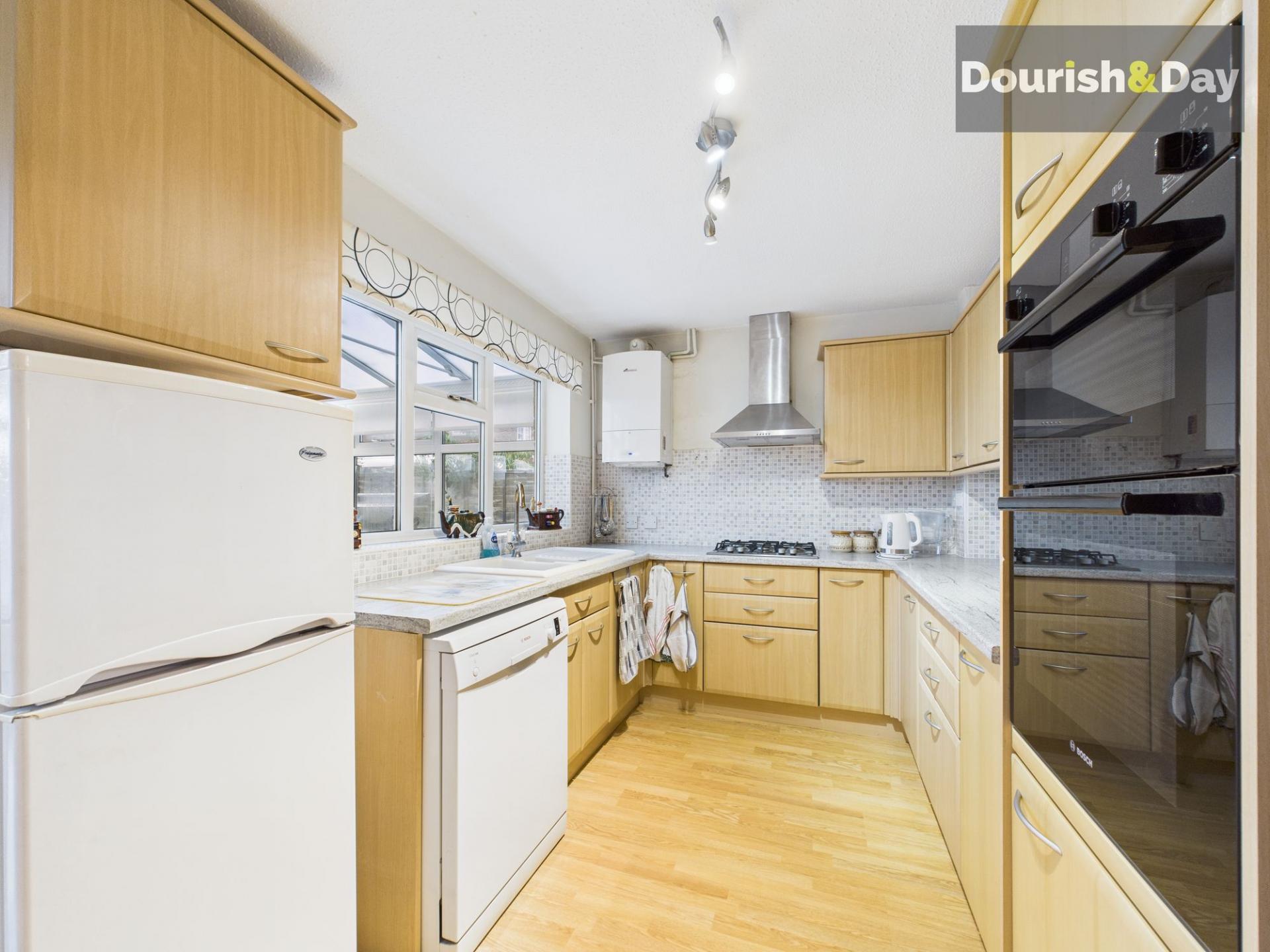 Stretching across the full width of the rear of the property, the conservatory provides excellent additional living space and enjoys direct access out to the garden. One section is fitted with a worktop and space for utility appliances, making it both practical and flexible for everyday use. Completing the ground floor is the kitchen, which is fitted with a modern range of units, complementing worktops, an integrated oven, four-ring gas hob with extractor hood above, and space for further appliances.