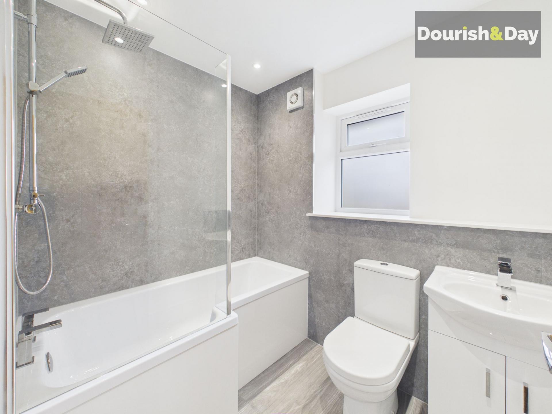 The family bathroom is fitted with a contemporary white suite, including a panelled bath with mains-fed shower over and glass screen, wash hand basin with storage beneath and low-level WC. The room is finished with splashback tiling, downlights and a window to the rear.