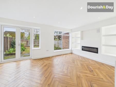 The living area features a sleek media wall with inset electric fireplace, creating a contemporary focal point, while double glazed windows to both the front and rear allow natural light to flow through. Double French doors open directly onto the garden, enhancing the sense of space.