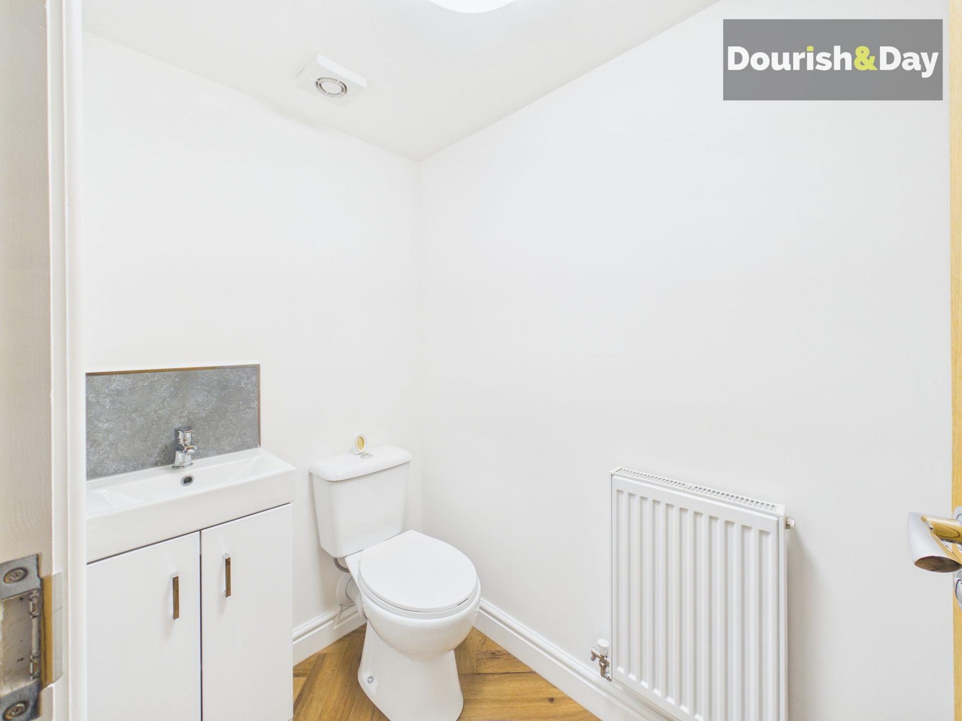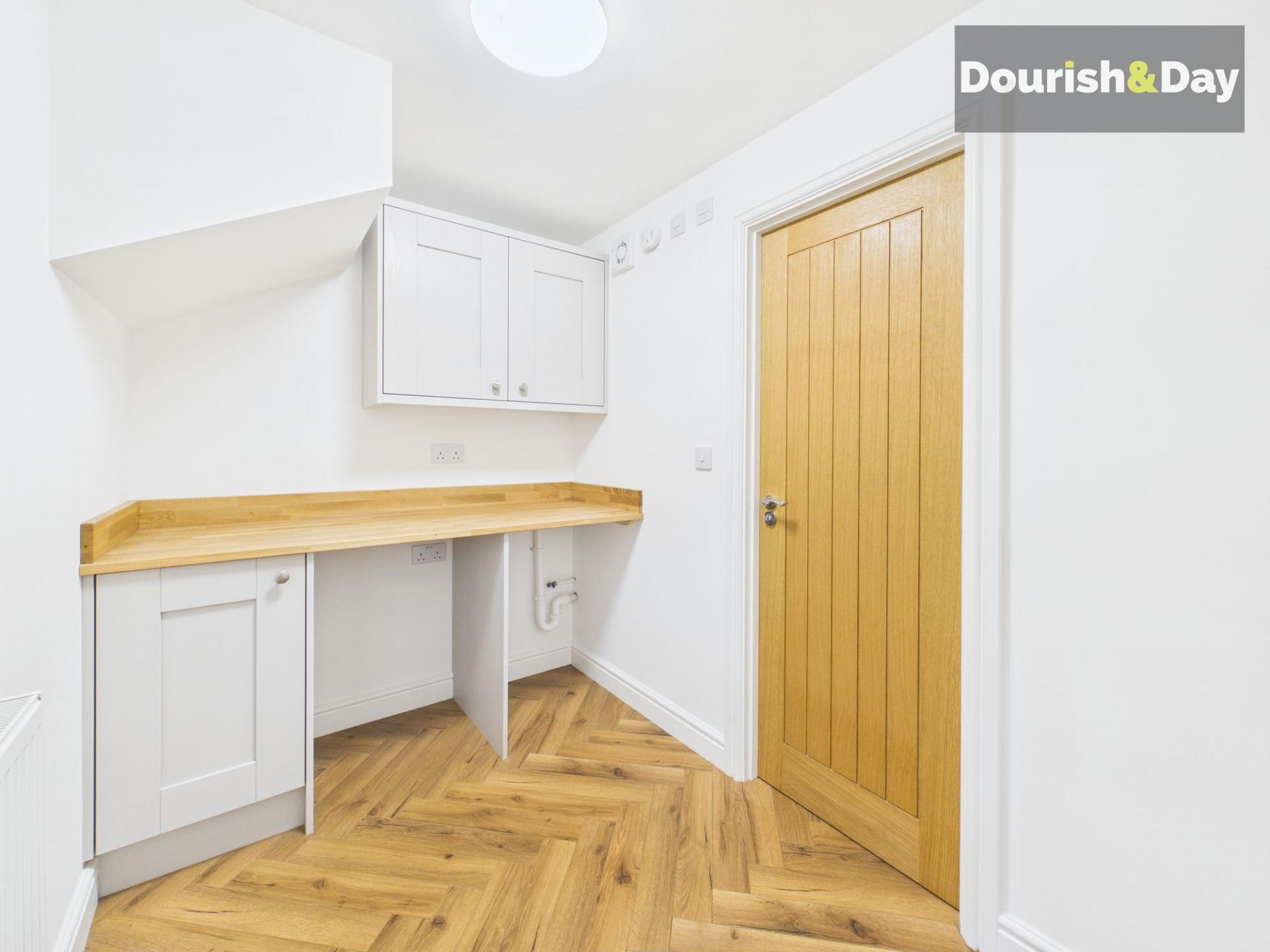 The garage has been partially converted to create a highly practical utility room, fitted with base units and under-counter space for appliances, continuing the herringbone flooring. From here, access leads through to a stylish guest WC, fitted with a modern white suite and built-in storage cupboards housing the boiler.
