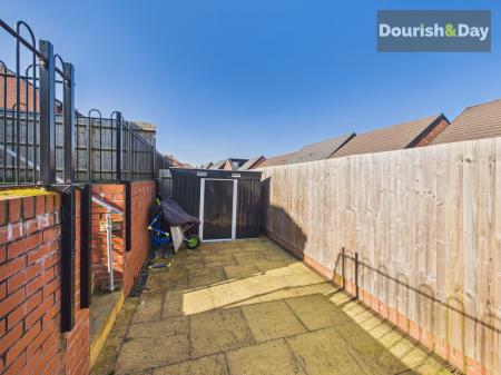 The rear garden begins with a paved seating area just outside the doors, with a pathway leading to the side gate. A lawn stretches beyond before steps lead down through a gated and metal fenced section to a lower paved area where a useful storage shed is positioned.