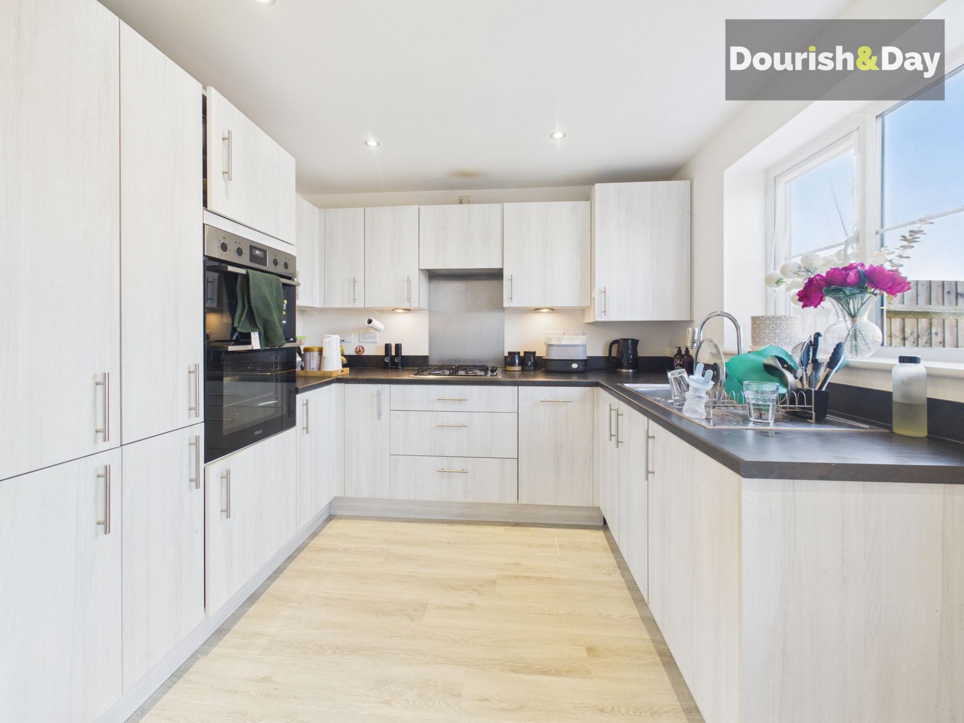 The kitchen diner forms the social hub of the home, offering good space for both cooking and dining. The kitchen itself is fitted with integrated appliances including dishwasher, double oven, fridge freezer and washing machine, alongside a four burner hob. Double French doors open directly onto the garden, drawing in natural light and creating an easy connection between indoor and outdoor space.