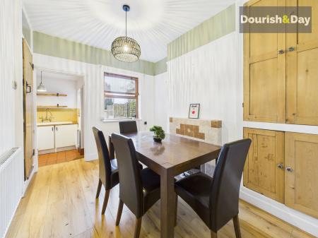 From here, the home flows through to the dining room, a generous second reception, again featuring an open fireplace, built-in storage and pleasant views out over the garden. It’s a flexible space that easily accommodates a dining table, home working or additional seating, and it naturally connects the front of the house with the kitchen beyond.