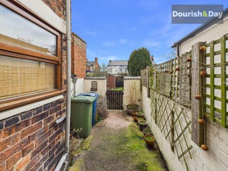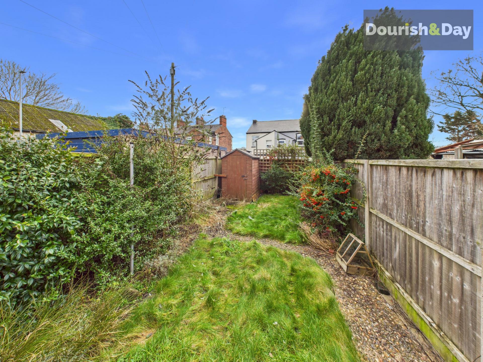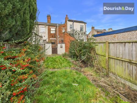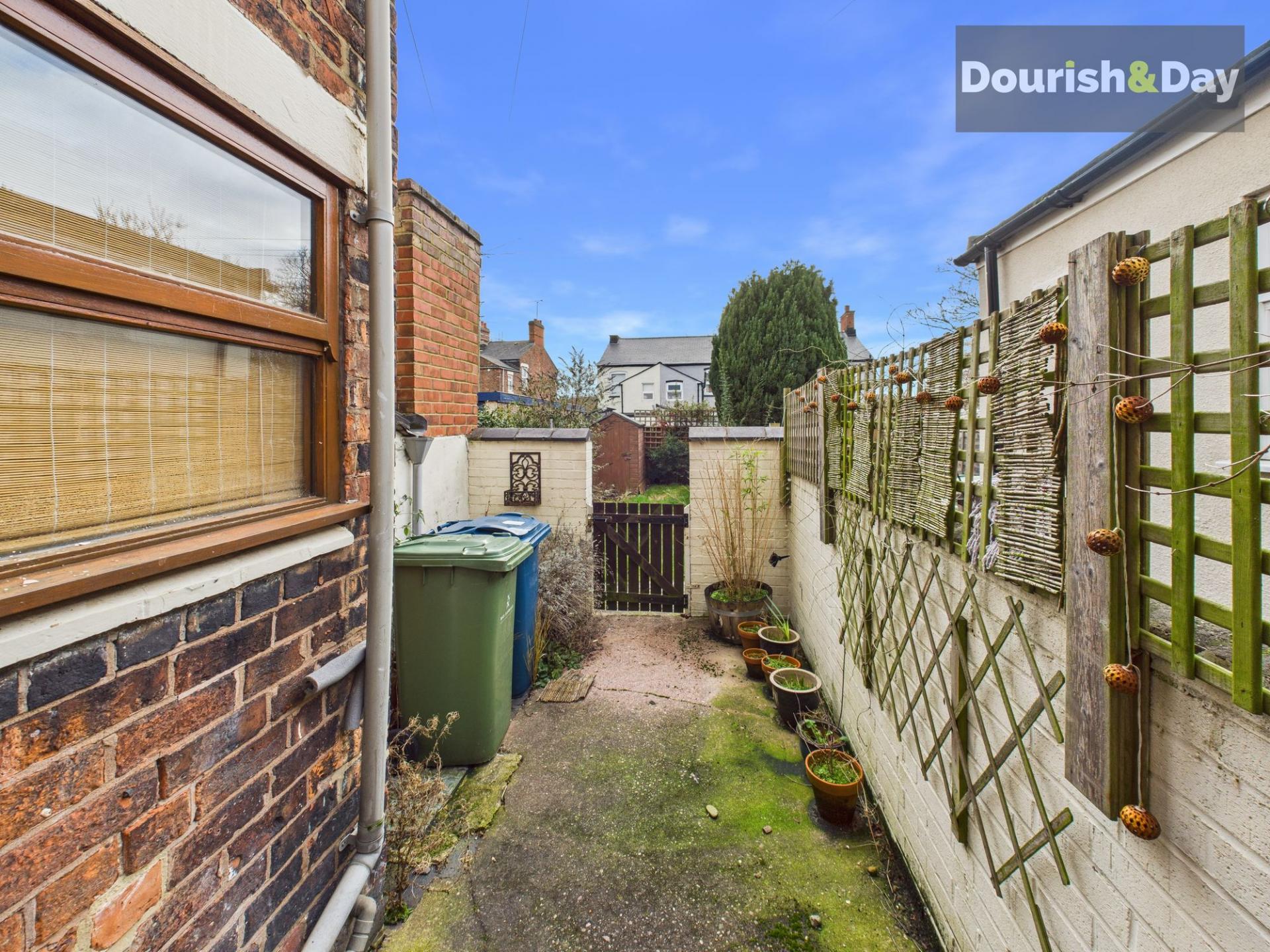The kitchen is fitted with modern units and offers a smart, functional setup, complete with a double integrated oven and four burner hob. A door leads out to a rear courtyard, providing a handy outdoor area for bins and storage, as well as gated access to the rear alleyway. Beyond the courtyard, a further gate opens into the main garden, which is laid to lawn with a gently winding path leading up to a shed at the far end, offering more outdoor space than you might expect from a home in this location.