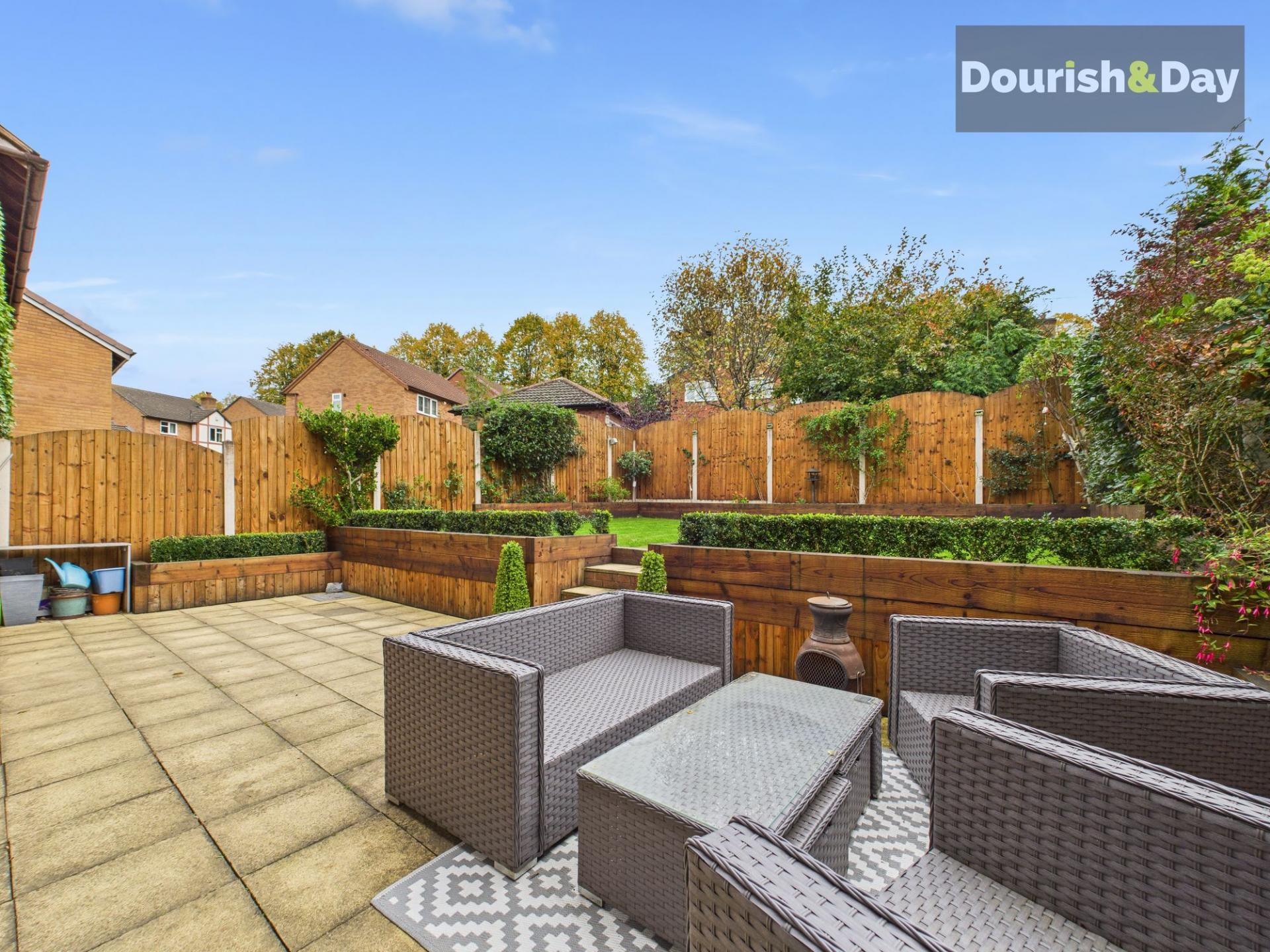Outside, the property is approached via a double-width driveway leading to a single integral garage, with a neat front lawn adding to its kerb appeal. The rear garden has been thoughtfully designed for both relaxation and play, featuring a paved seating area that steps up to a well-kept lawn bordered by wooden sleepers and space for planting.