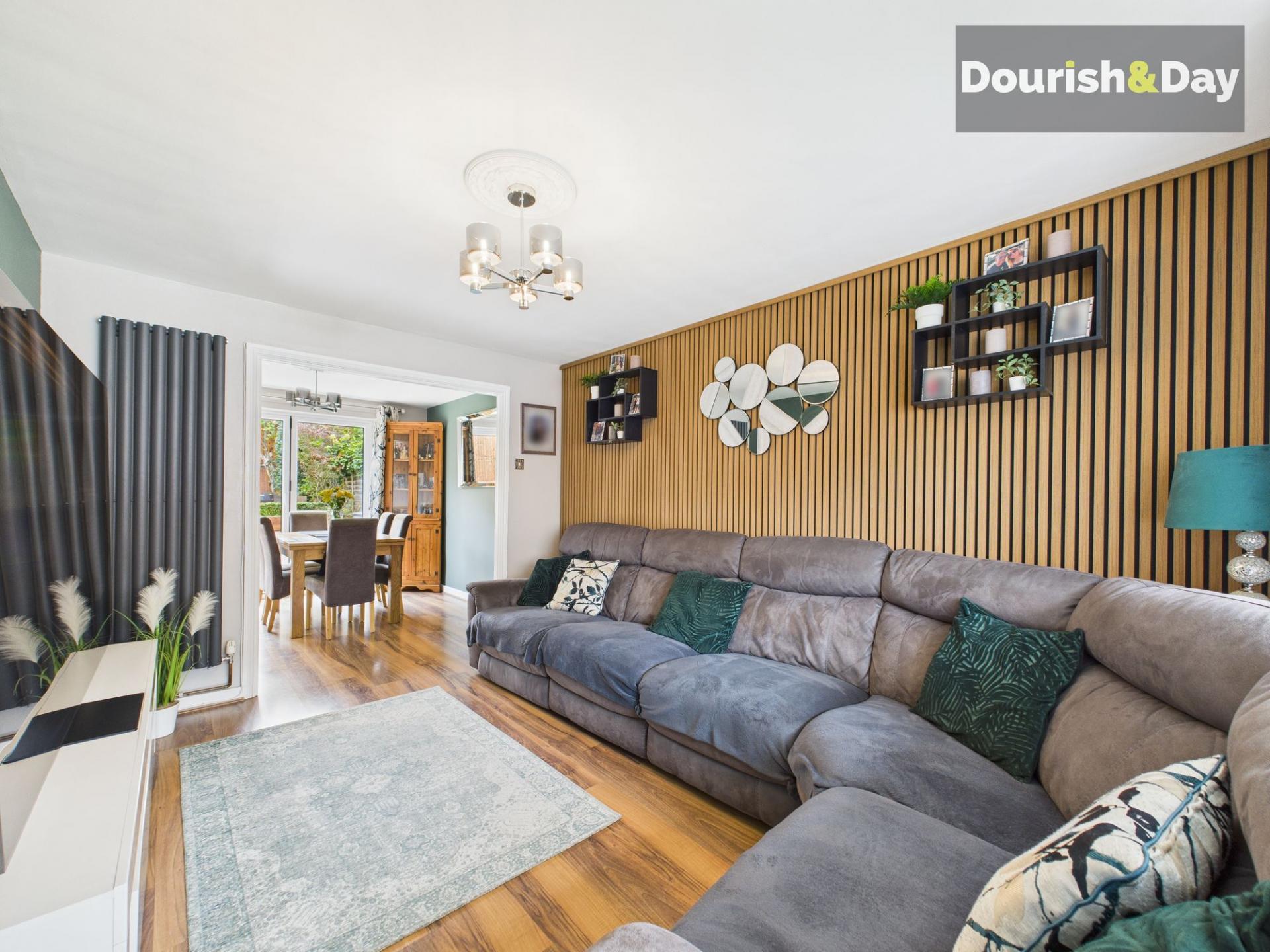 The home welcomes you with an inviting entrance hallway, where stairs rise to the first floor and doors lead through to the main reception rooms. The living room is bright and spacious, featuring a front-facing bay window that floods the space with natural light and a stylish wall of acoustic-style panelling that adds a modern touch. An open layout connects this room to the dining area at the rear, creating a sociable flow through the ground floor that’s perfect for family life and entertaining. The dining room enjoys bi-folding doors that open directly onto the rear garden, allowing easy access to outdoor space and providing a lovely setting for summer meals and gatherings.