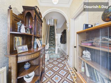 The property is approached via a traditional terraced frontage with a low boundary wall, leading into the entrance hallway where original Minton tiles immediately add character. Stairs rise to the first floor and a useful under-stairs storage cupboard provides everyday practicality.