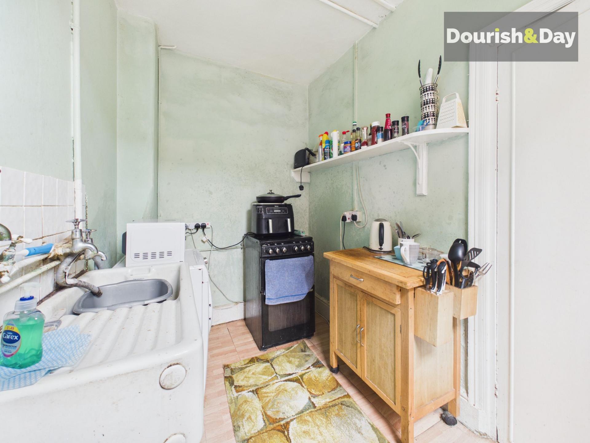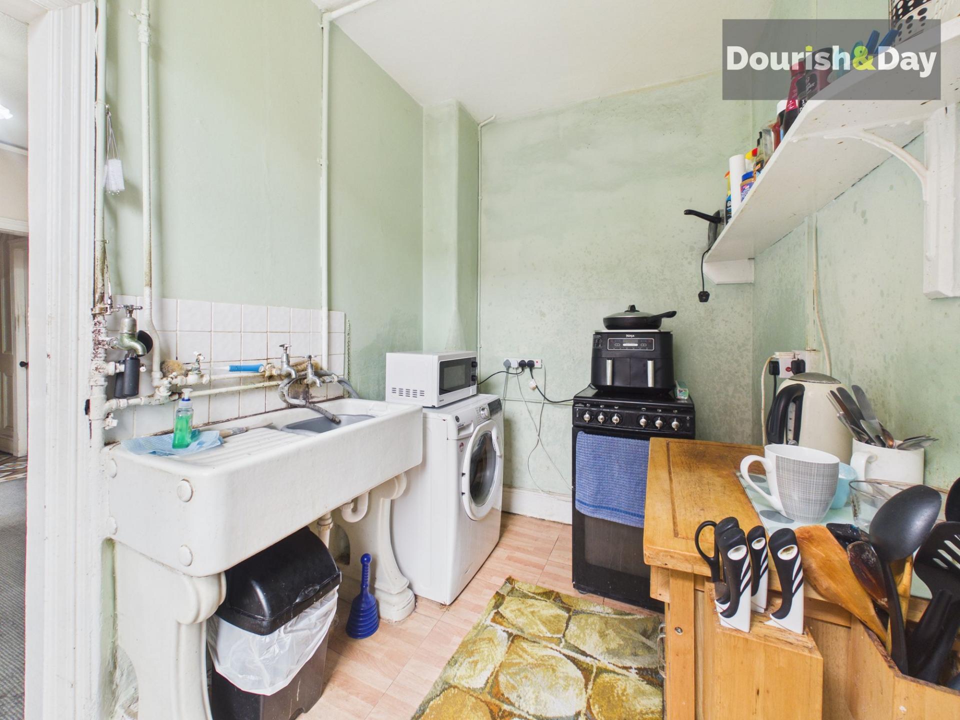 The kitchen follows on from the dining room and currently provides a sink and space ready for the installation of units, presenting a clear opportunity for modernisation and reconfiguration to suit modern living.