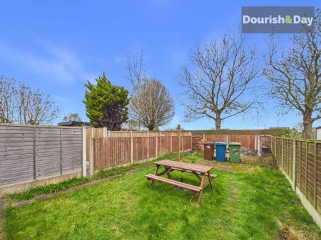 Outside, the garden begins with a paved area running along the side of the house before opening out to a lawned section. A path runs up the left-hand side leading to a gate which provides access to the rear service road. To the back of the garden sits a pebbled area along with an additional external storage room.