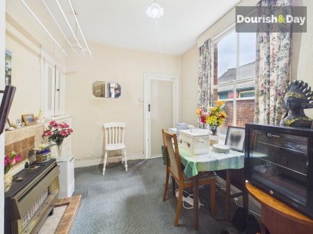 To the right sits a front reception room currently used as a bedroom, featuring a bay window that brings in plenty of natural light. Beyond this is the main living room, centred around a gas fireplace. To the rear of the hallway sits the dining room, offering a well-proportioned space for entertaining.