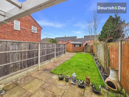 The rear garden has been thoughtfully landscaped and begins with a paved seating area directly outside the house, partially covered by a canopy connected to the rear of the property which provides a sheltered outdoor seating space. Beyond this sits a shaped lawn bordered by beds filled with a variety of plants and shrubs. Additional paved areas extend around the garden including a further seating space in the corner with a storage shed, while a side gate provides convenient access back to the front of the property.