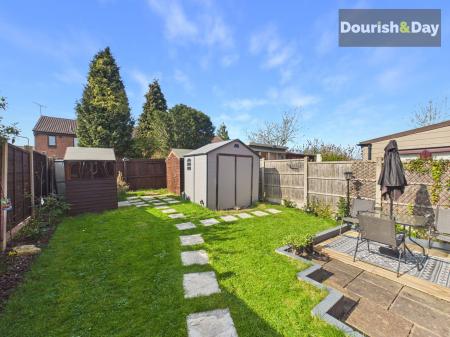 Outside, the rear garden begins with a paved patio area, leading onto a lawned section. A further paved seating area sits to the right, while a pathway runs up the garden toward a couple of useful sheds positioned at the rear.