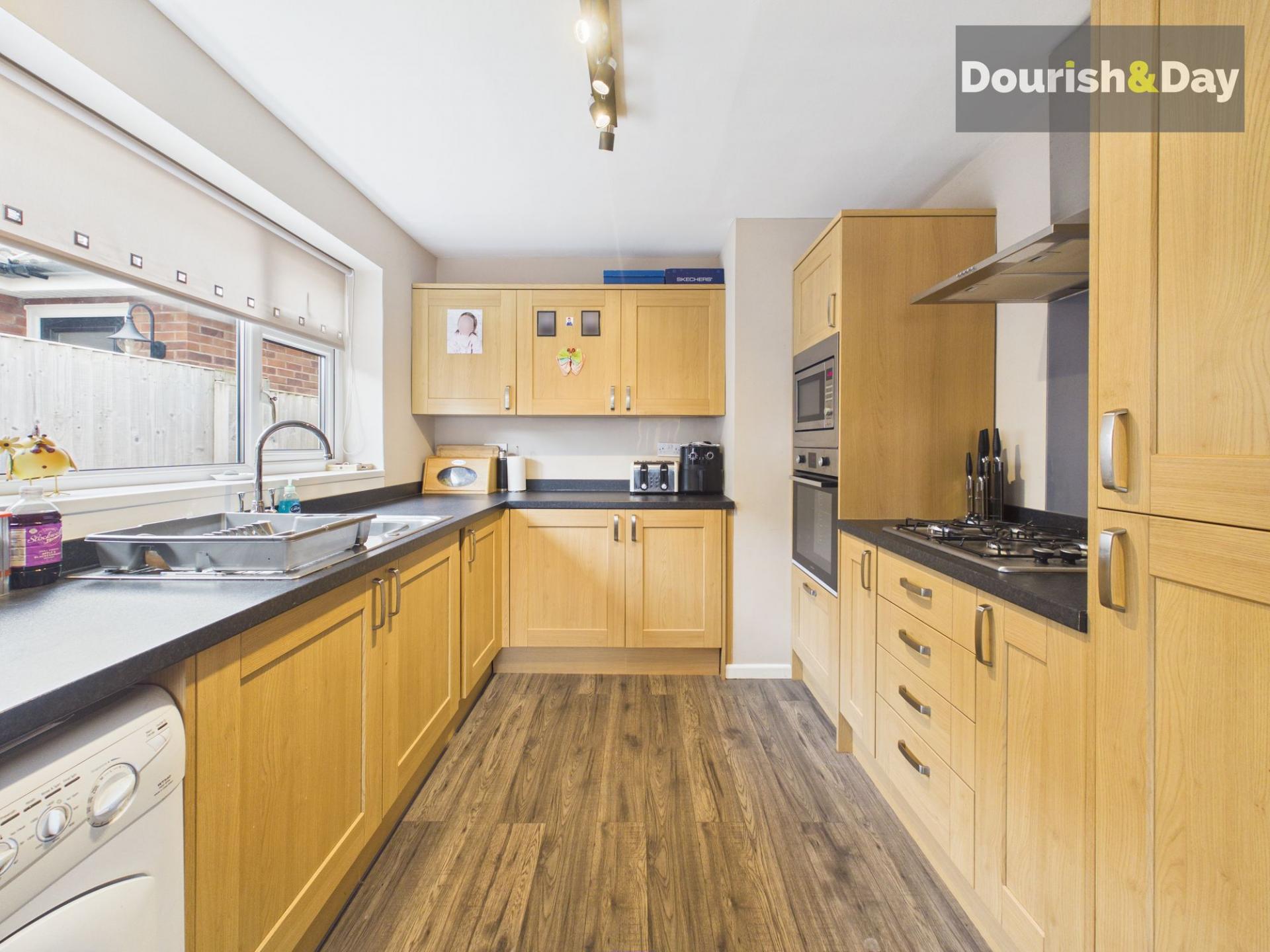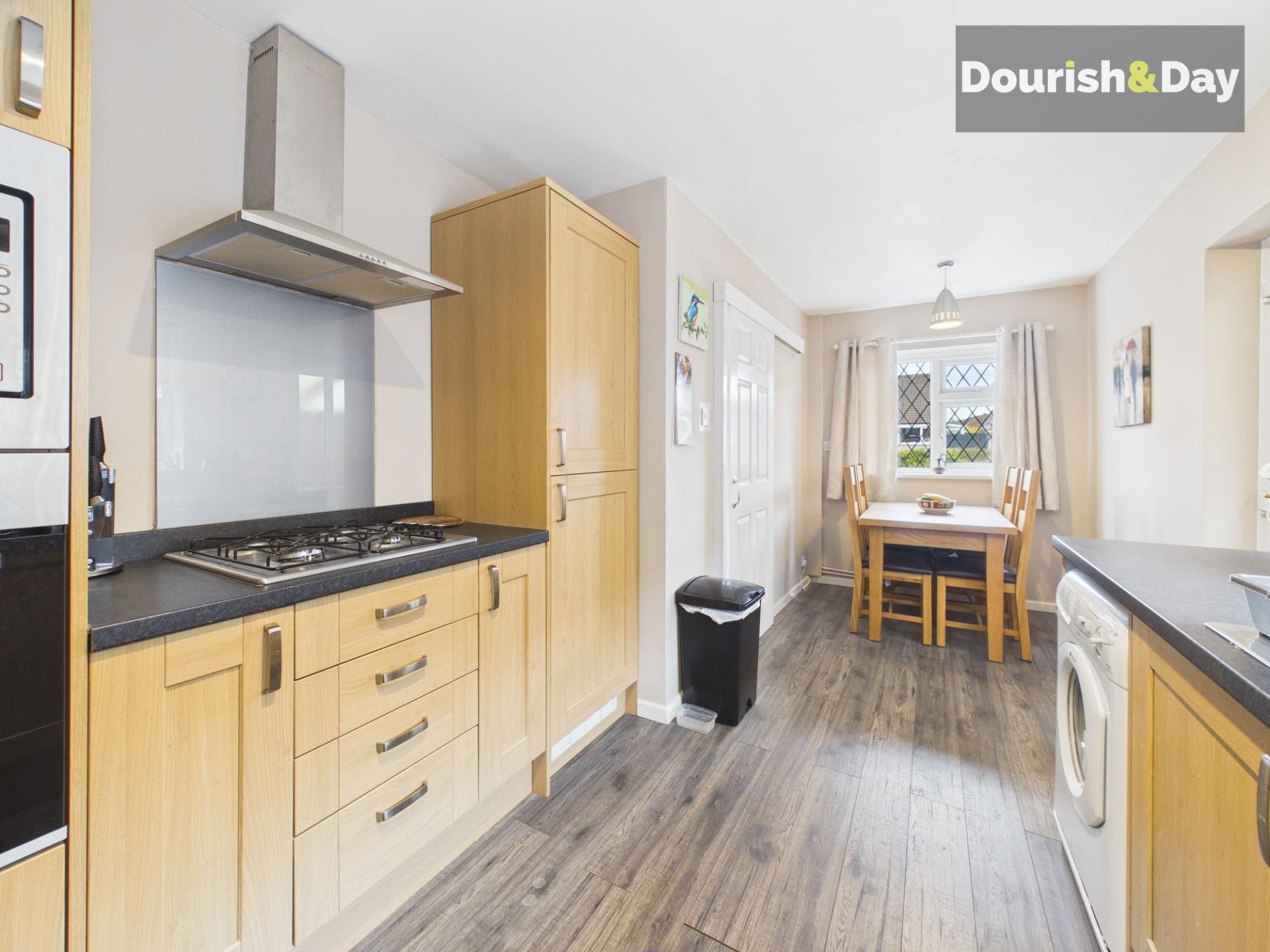 The kitchen is fitted with integrated appliances including oven, microwave and fridge freezer, along with a four-burner hob. A door leads out to the side of the property where a lean-to provides useful covered space and access through to the garden.