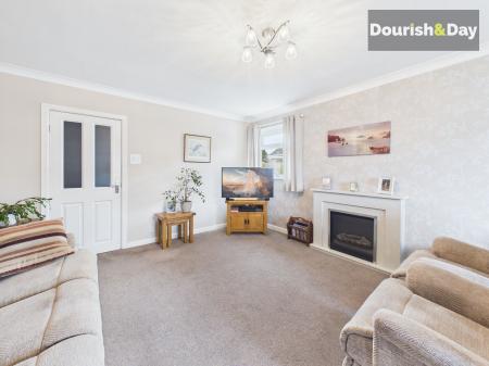 Step inside and the entrance hallway leads to the main living spaces. To the right sits the lounge, a bright and comfortable reception room centred around an electric fireplace. To the left is the kitchen and dining room, offering a practical and sociable space with room for a dining table.