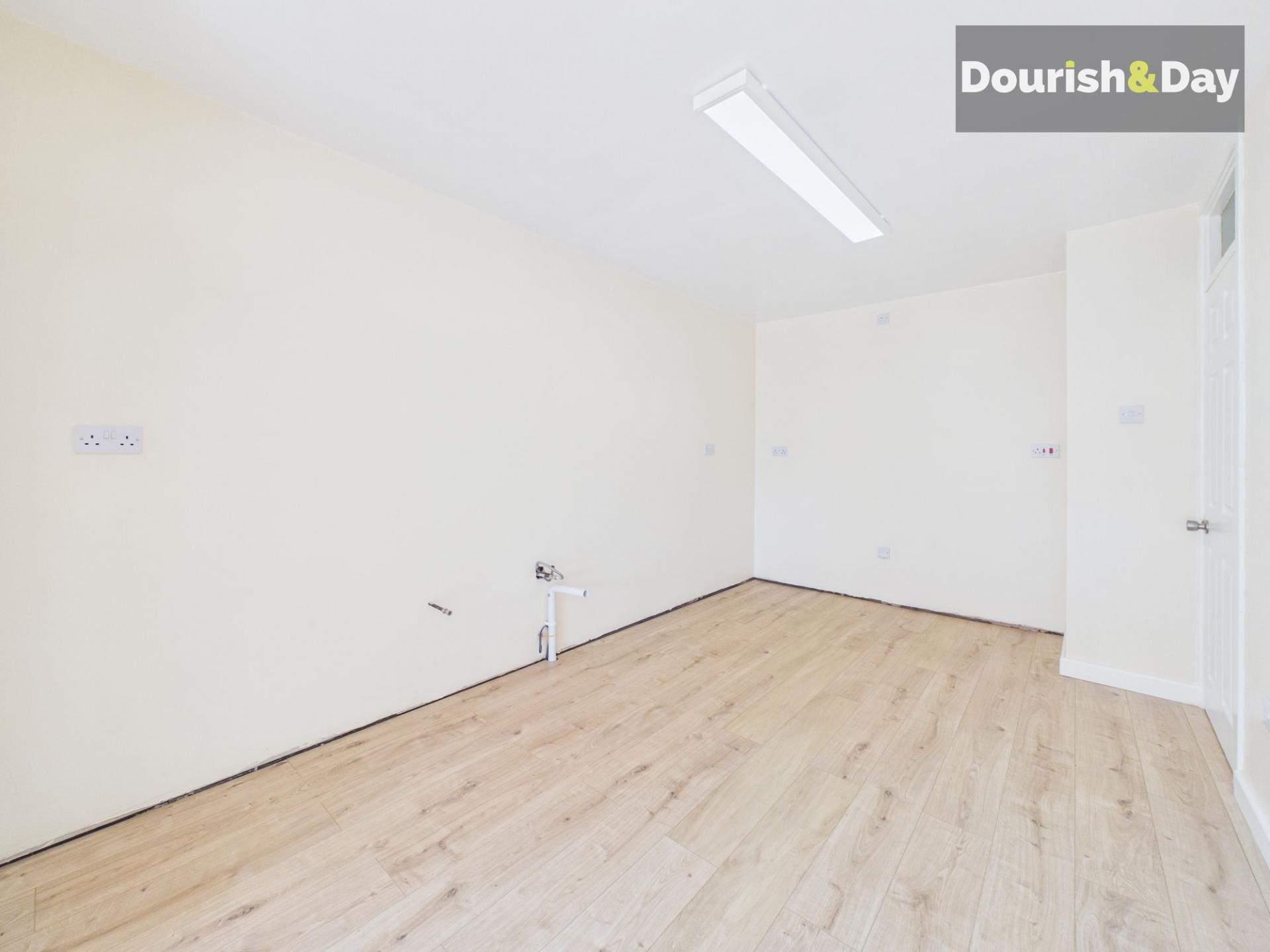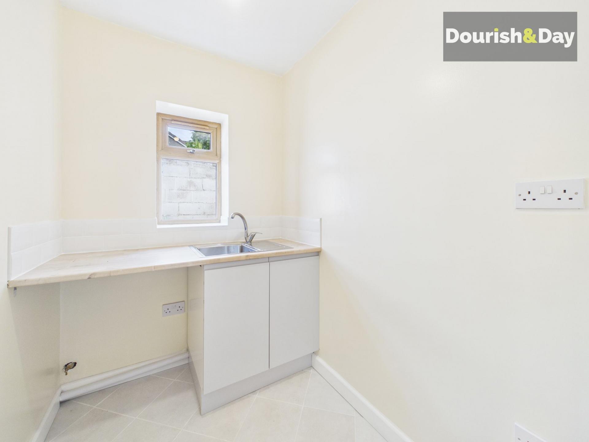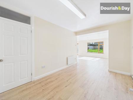 The kitchen area has been thoughtfully prepared, offering a blank canvas for a new owner to design and install a kitchen to suit their own style and taste. It flows seamlessly into a bright and spacious living/dining area, flooded with natural light and enhanced by French doors opening onto the south-facing rear garden.