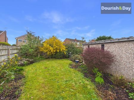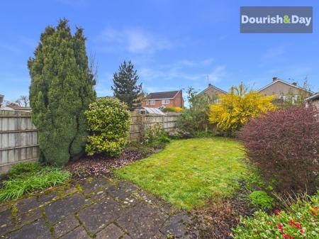 Outside, the rear garden begins with a paved area before leading onto a lawned section, bordered by mature shrubs which provide a good degree of privacy.
