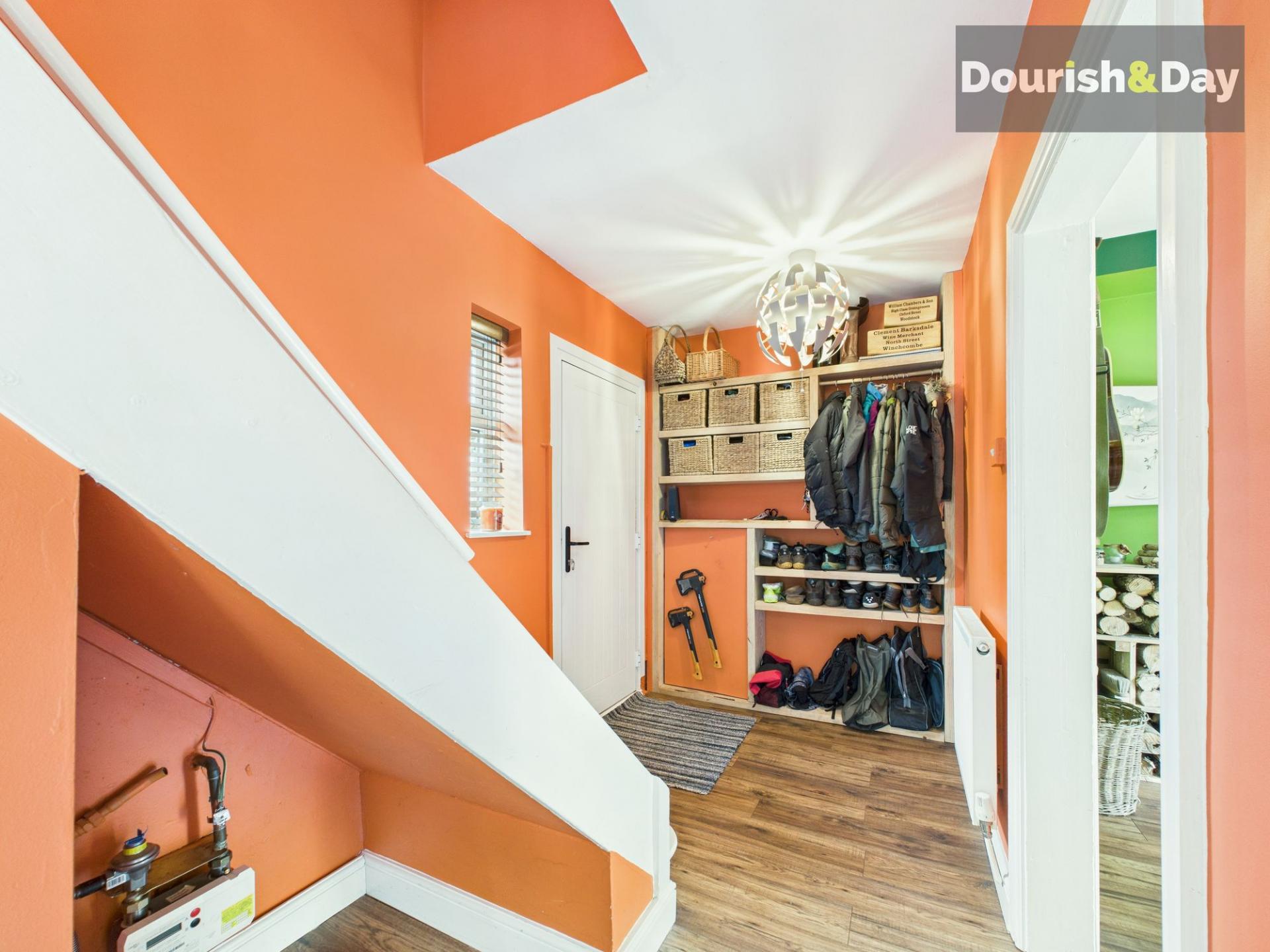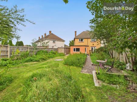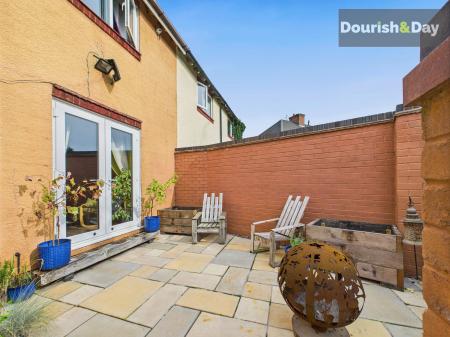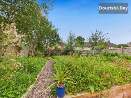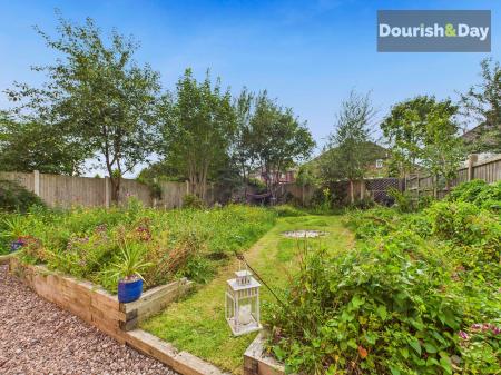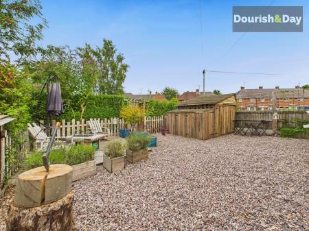 Upstairs, there are three bedrooms, two of which are generous doubles, alongside a well-proportioned single room. The family bathroom is fitted with a stylish, modern suite. Outside, the property is approached via a pedestrian gate leading into an enclosed gravelled frontage that gives a neat and low-maintenance first impression. To the rear, the mature garden is a delight for those who enjoy spending time outdoors, featuring a patio seating area, a lawn with a sunken fire-pit, and vibrant meadow-style planting. There are also self-built wooden storage sheds to the side of the house, providing excellent additional storage space.
