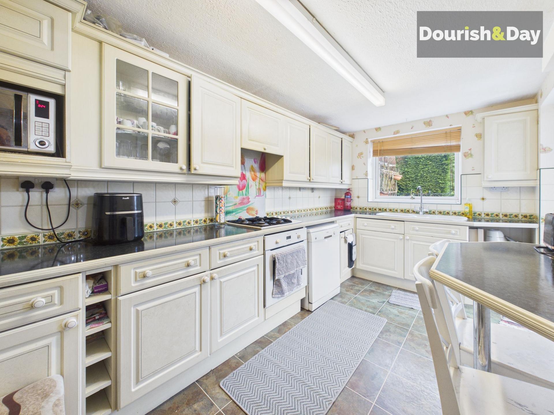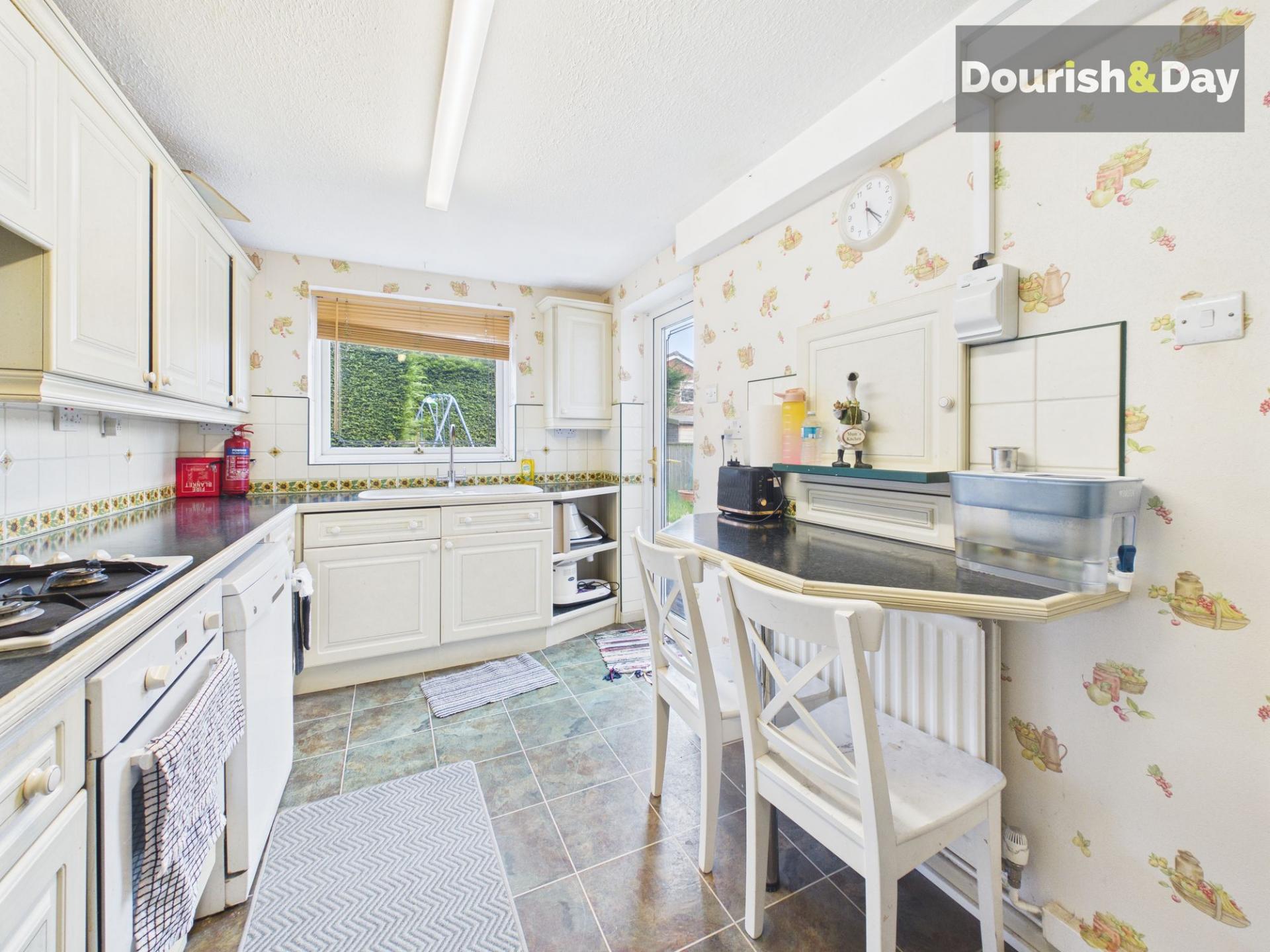 An archway leads through to the dining area, where sliding doors open directly onto the garden, allowing natural light to move easily across the ground floor. From here, access is provided to the guest WC, with a useful under stairs storage cupboard positioned opposite. The kitchen sits to the rear and offers space for a dishwasher, integrated fridge, integrated oven with four burner hob, and doors leading both to the garden and through to the garage, adding day to day convenience.