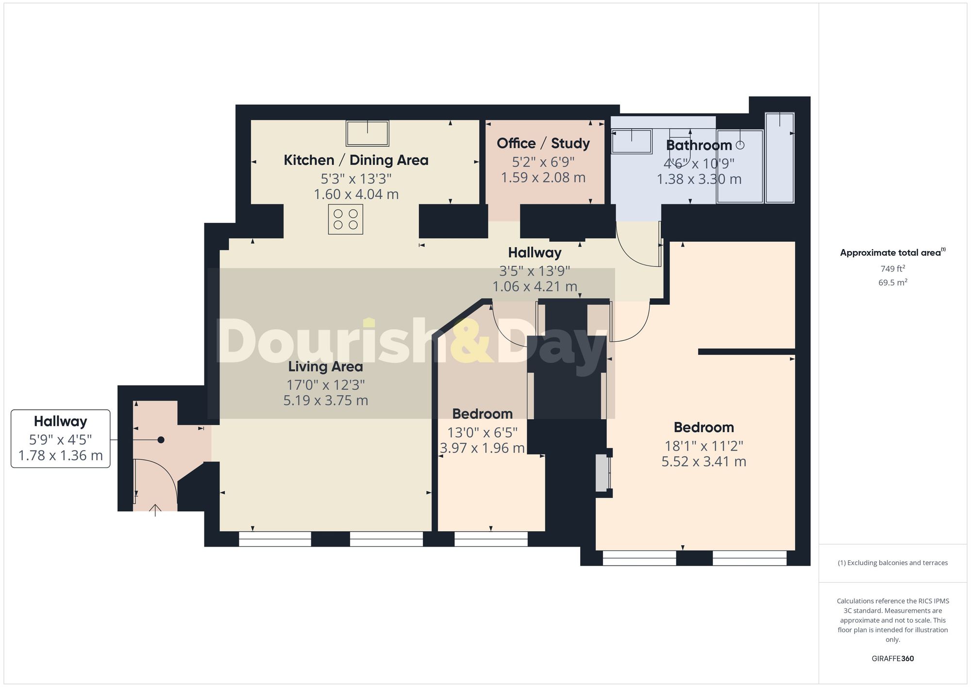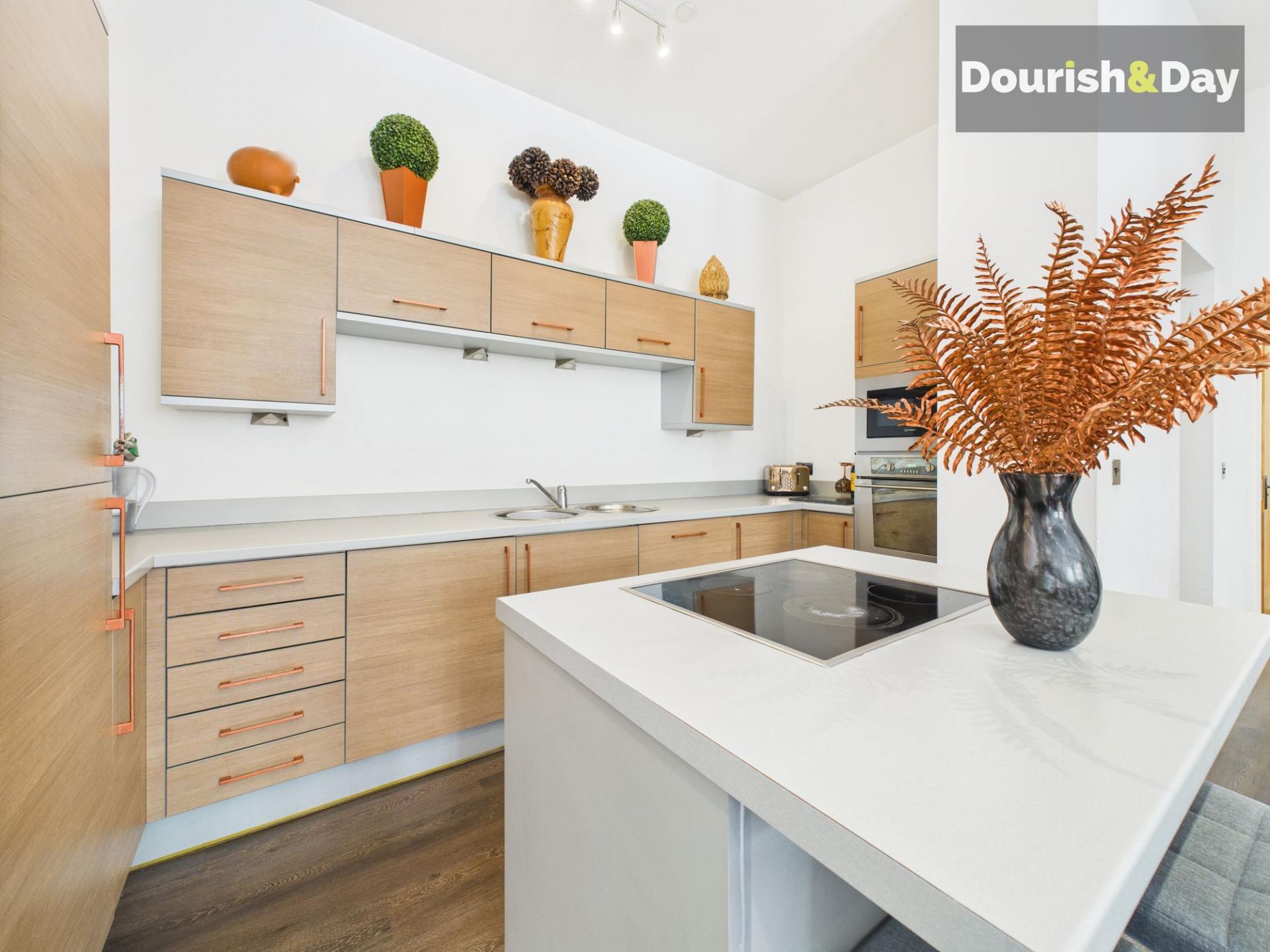 Internally, the apartment is well maintained throughout and features a welcoming entrance hall, a stunning open-plan kitchen and living area with a central island ideal for dining and entertaining, a generously sized main bedroom with a walk-in wardrobe, a second double bedroom, a separate study, and a contemporary family bathroom complete with both a panelled bath and a separate shower cubicle.