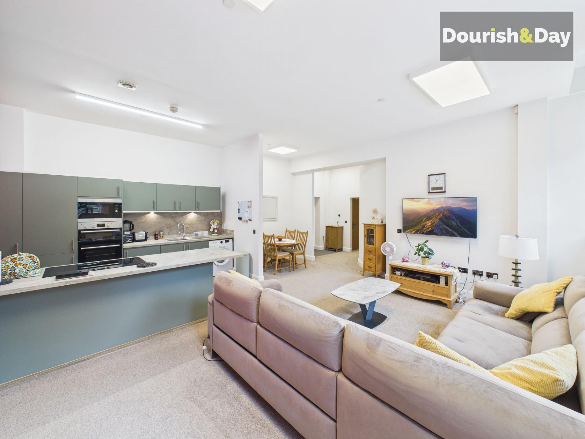 The accommodation is well appointed and comprises an entrance hall leading to a stunning open-plan kitchen/living/dining area. This impressive space is enhanced by three large bespoke double-glazed sash windows, high ceilings, and a modern kitchen fitted with integrated appliances. An inner hall provides two storage cupboards, a main double bedroom with dressing area, a second bedroom, and a contemporary bathroom.