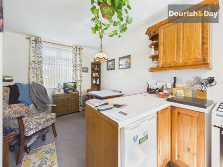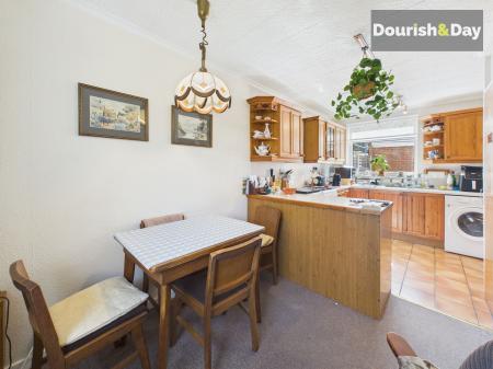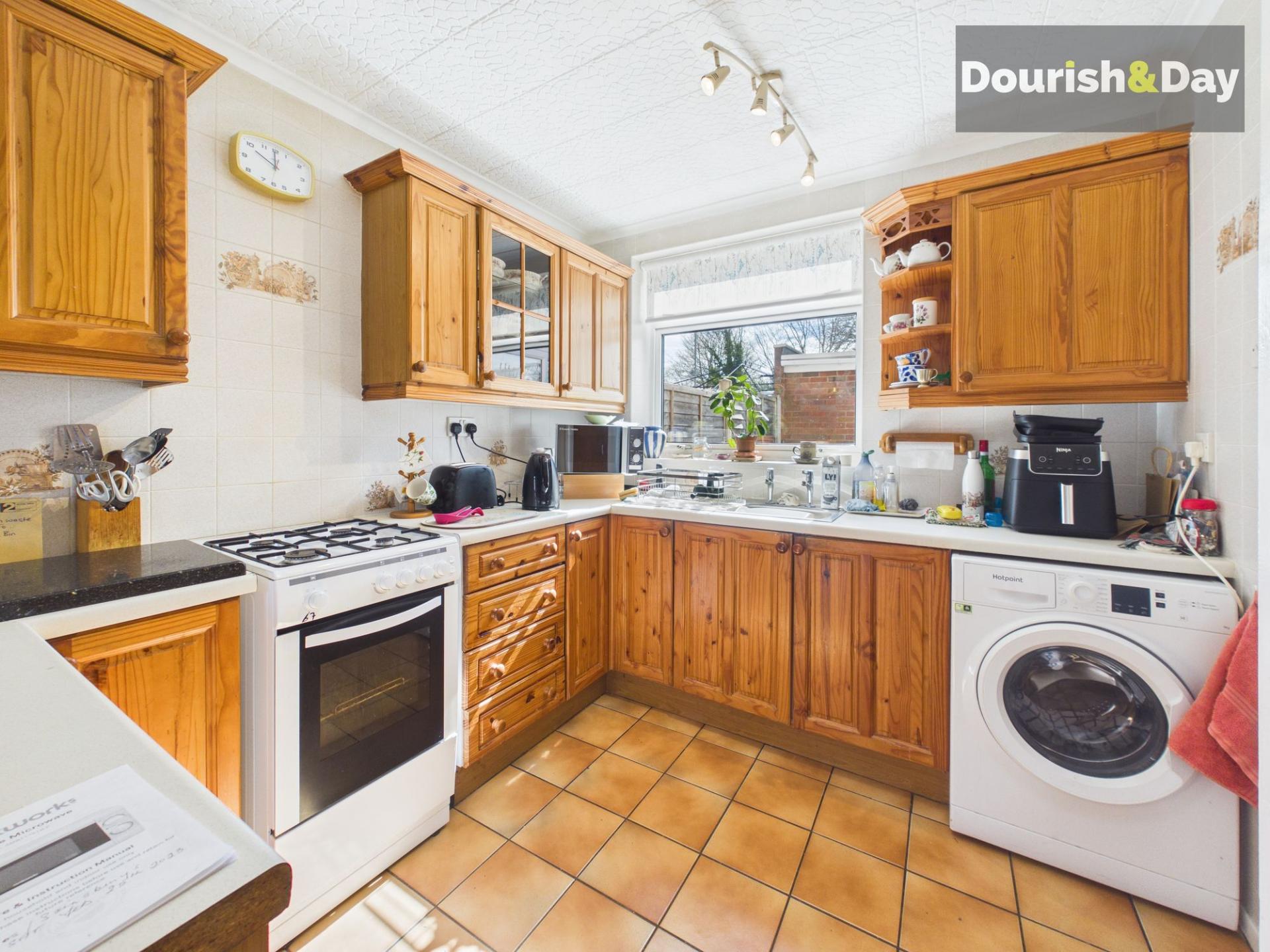 The kitchen offers a well-proportioned layout, with a dining area to the front and the kitchen positioned to the rear, separated by a breakfast bar. There is a useful pantry cupboard, space for two under-counter appliances, a freestanding oven and a four-burner hob.