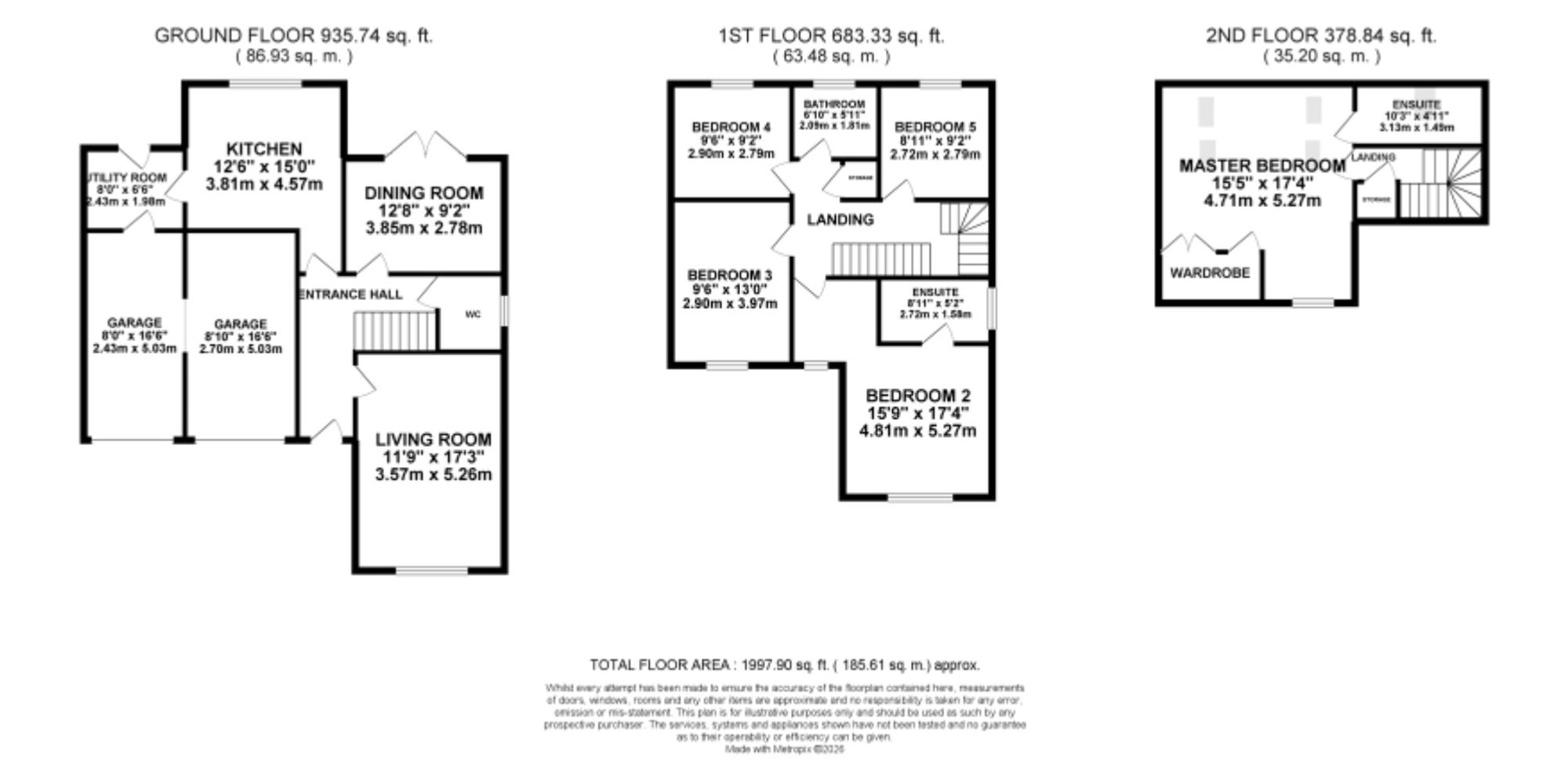 - Five double bedrooms including luxurious master with dressing area and en suite, plus top-floor suite with fitted wardrobes and en suite shower room.