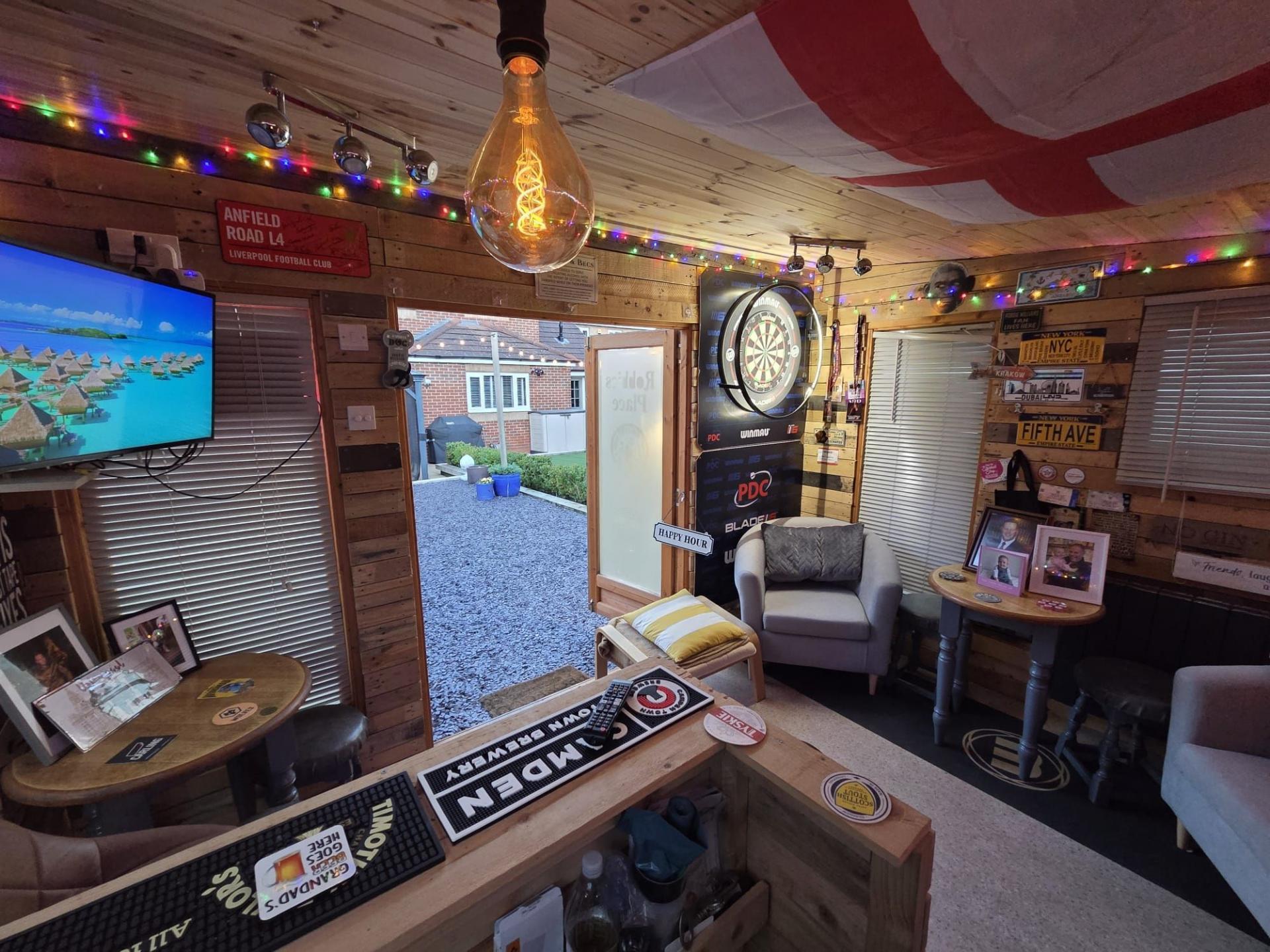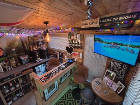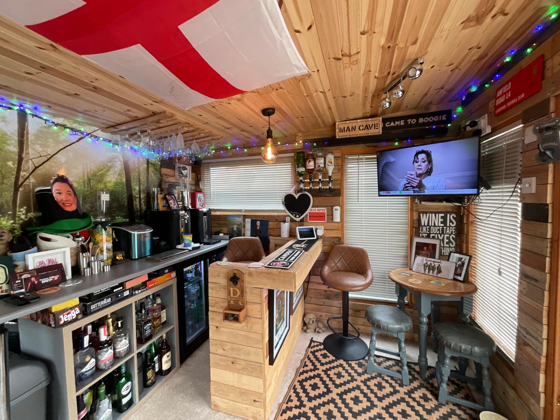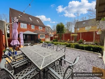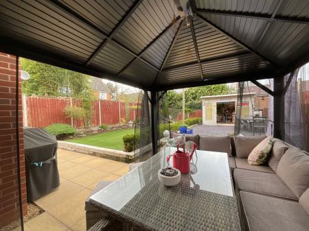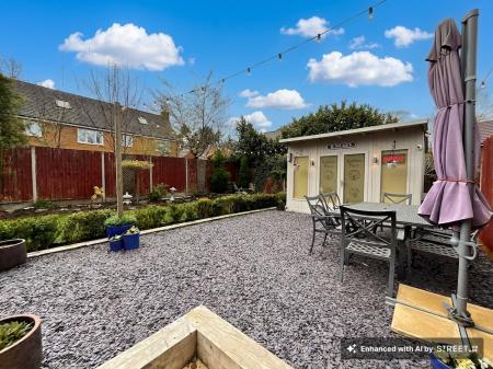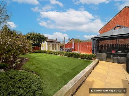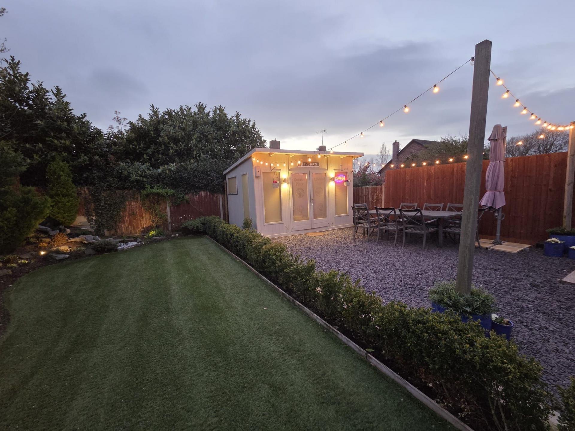 - Beautiful West-facing landscaped garden featuring patio, slate seating areas, artificial lawn, mature planting, a waterfall, beautiful lighting and a fully fitted outdoor bar ideal for entertainin...