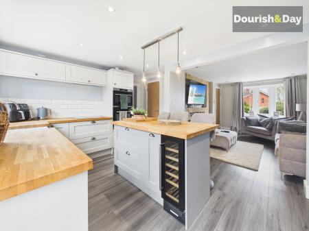 The space flows naturally into the kitchen, which wraps around the rear of the lounge to create a semi open-plan layout. The kitchen is a real highlight, centred around an island which also incorporates a wine fridge. Additional integrated appliances include a full-length fridge, separate freezer and dishwasher, along with a Belfast sink. A useful under-stairs storage cupboard adds practicality.
