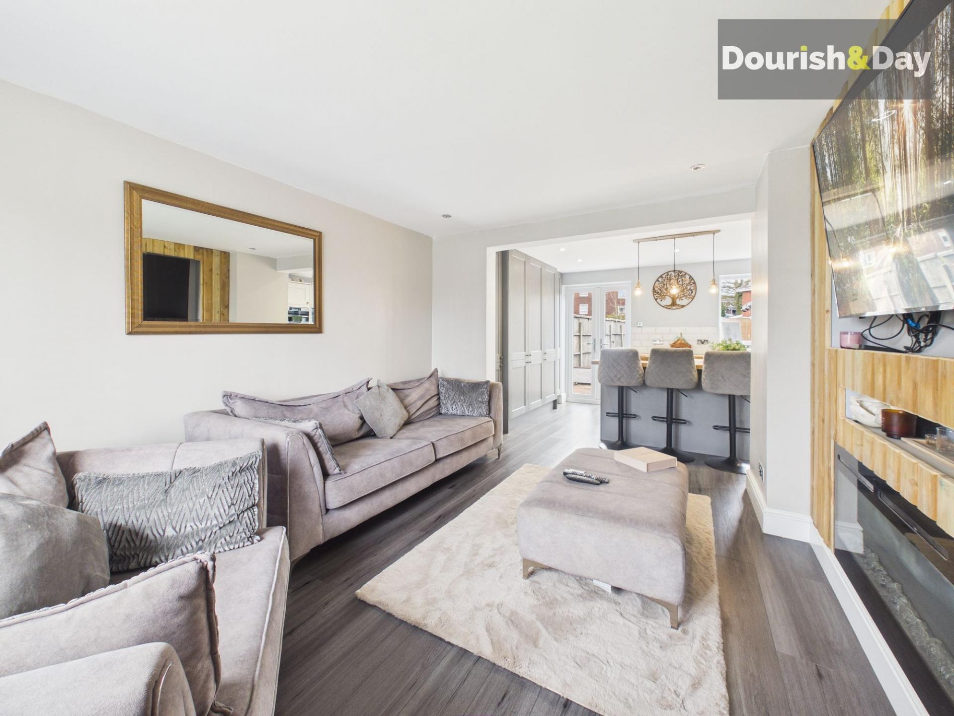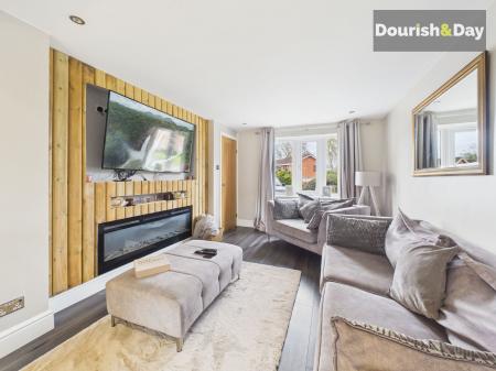 Step inside and the entrance hallway provides access to the first floor and leads through to the main living space. The lounge is a stylish and welcoming area, featuring a contemporary media wall with electric fireplace and attractive wood panelling.