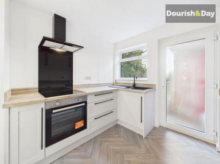The kitchen sits to the rear of the hallway and continues the home’s modern finish. Clean lines, neutral tones and practical touches come together nicely, with an integrated oven, four burner electric hob, intergrated fridge and freezer with plumbing ready for a washing machine. From here, a door leads out to the garden, where you’ll also find a handy external storage room, once a coal shed, now ideal for bikes, tools or seasonal bits and pieces.