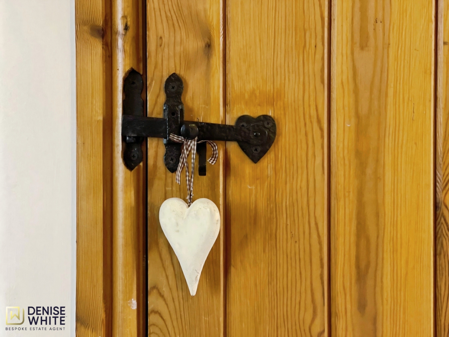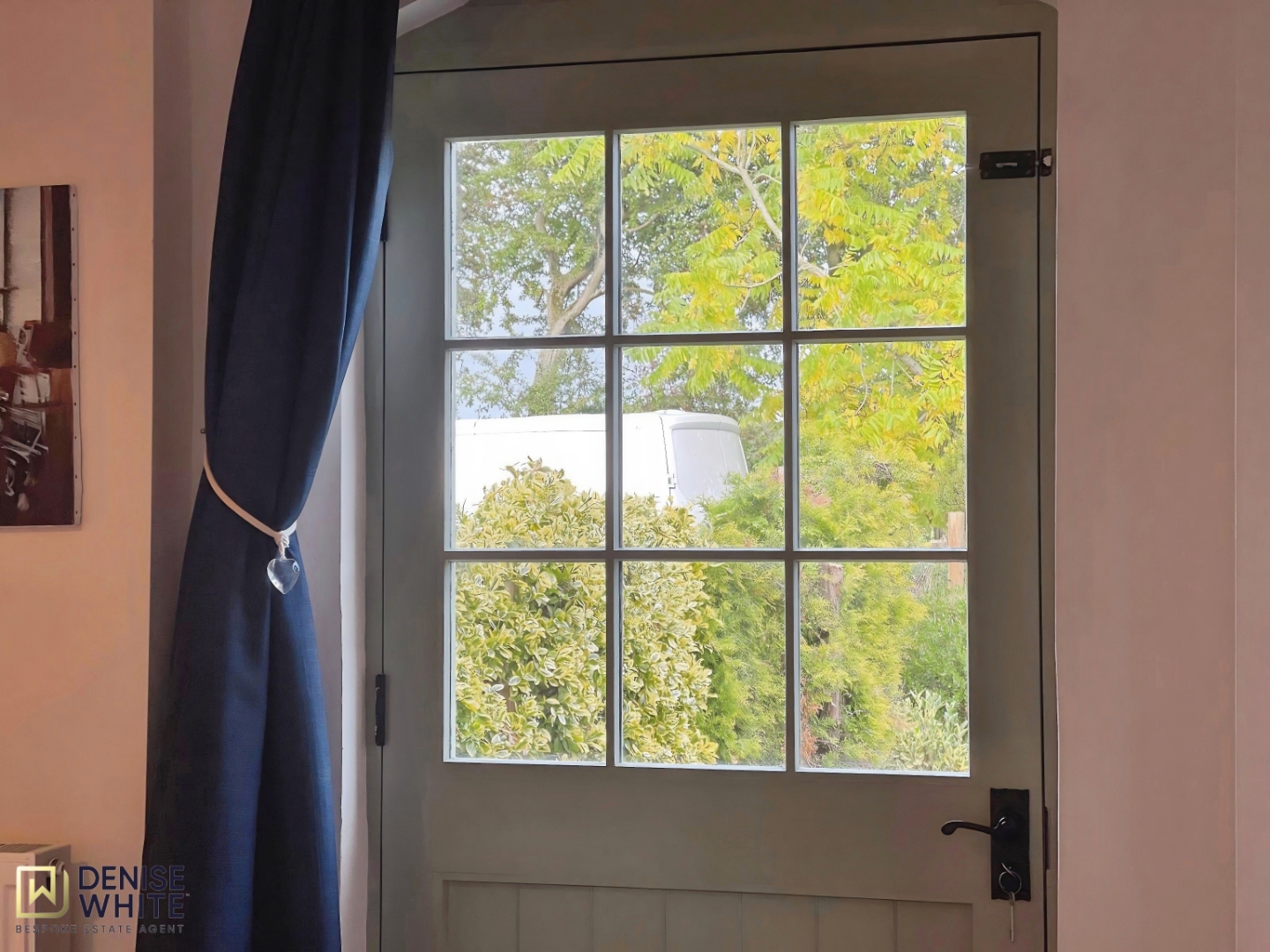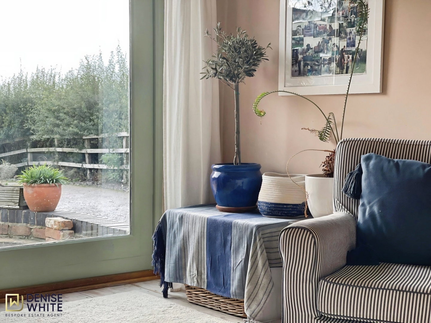- Large double-glazed door opening onto a sunny front patio with countryside views