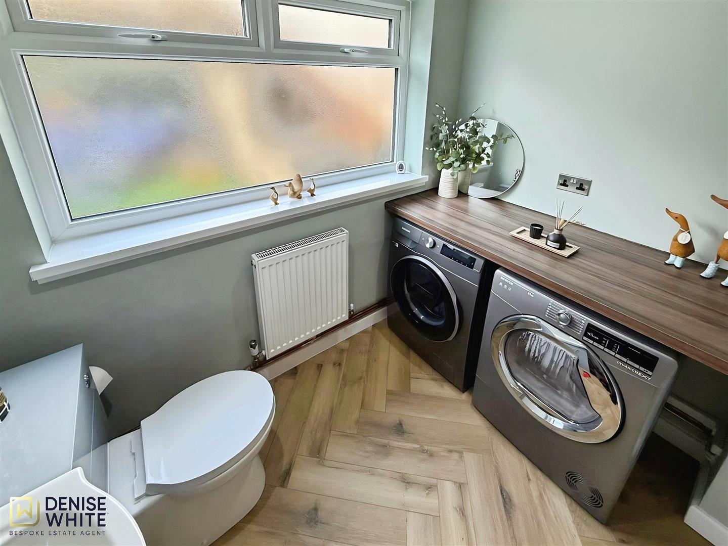 Utility Wc - 2.32 x 1.75 (7'7" x 5'8") - LVT herringbone flooring. Wall mounted radiator. Plumbing for washing machine. Low level WC. Wash handbasin. Work surface. Obscured uPVC double glazed window. Inset spotlights.