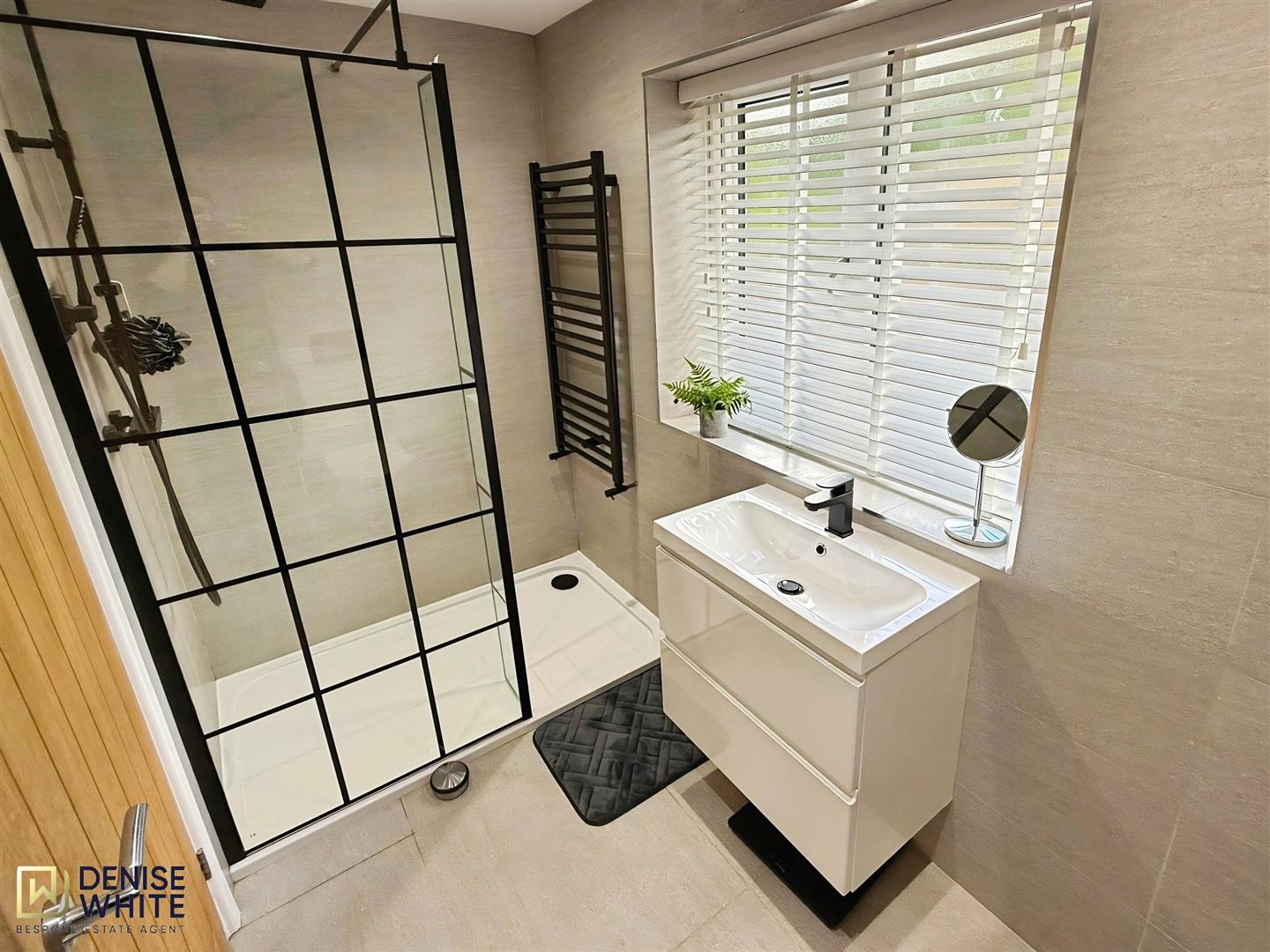 Ensuite - 2.61 x 1.39 (8'6" x 4'6") - Tiled flooring. Low level WC. Vanity style wash handbasin. Heated towel rail. Walk in shower with rainfall shower head. Obscured uPVC double glazed window. Inset spotlights.