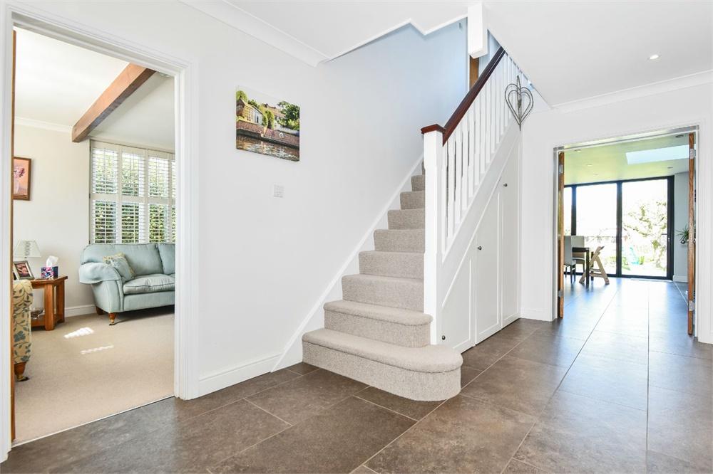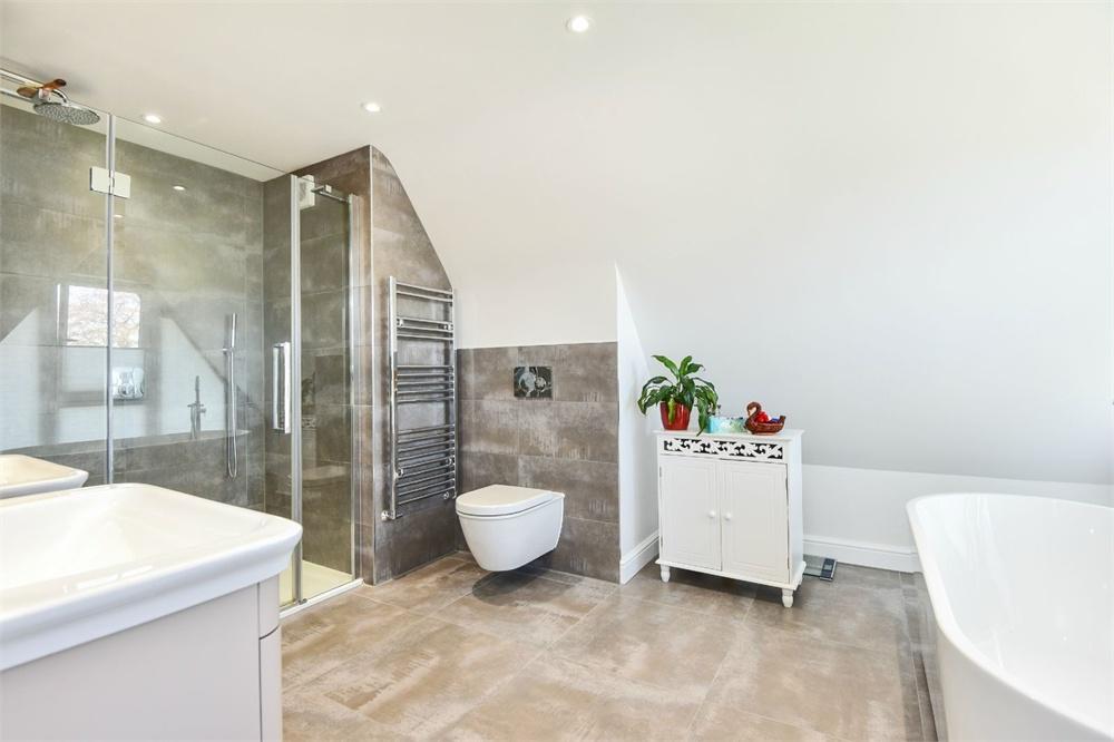 The property is approached via a gravel 'in and out' driveway which provides ample parking for several cars and leads to a pergola and larger than average single garage. The accommodation offers on the ground floor; a welcoming entrance hall, a good sized living room, a luxury open plan kitchen with a range of integrated appliances and island with bi-fold doors leading to the rear garden and further living area. In addition, there is a study, utility room and ground floor WC. On the first floor there are three double bedrooms, two of which benefit from en-suites. The second floor master bedroom suite offers fantastic elevated views across the River Thames along with a modern four piece bathroom with free standing bath.