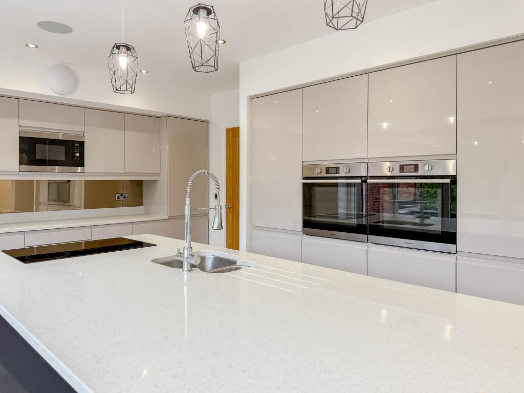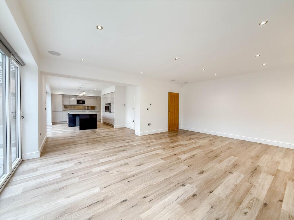 To the rear, a striking full-width ‘family hub’ forms the true heart of the home. Bi-folding doors with remote-controlled blinds create a seamless flow onto the south-facing patio, ideal for both everyday living and entertaining. The living area is enhanced by a bespoke media wall, while the contemporary kitchen is a true statement, featuring a large central island with luxurious quartz worktops, high-gloss cabinetry, quality integrated cookware, full-height fridge and freezer, wine cooler, microwave and dishwasher. A four-way ceiling speaker system elevates the ambience, and a practical utility room sits conveniently off the kitchen, equipped with a washing machine and tumble dryer. Zonal underfloor heating runs throughout the ground floor, contributing to the property’s coveted A-rated energy efficiency.