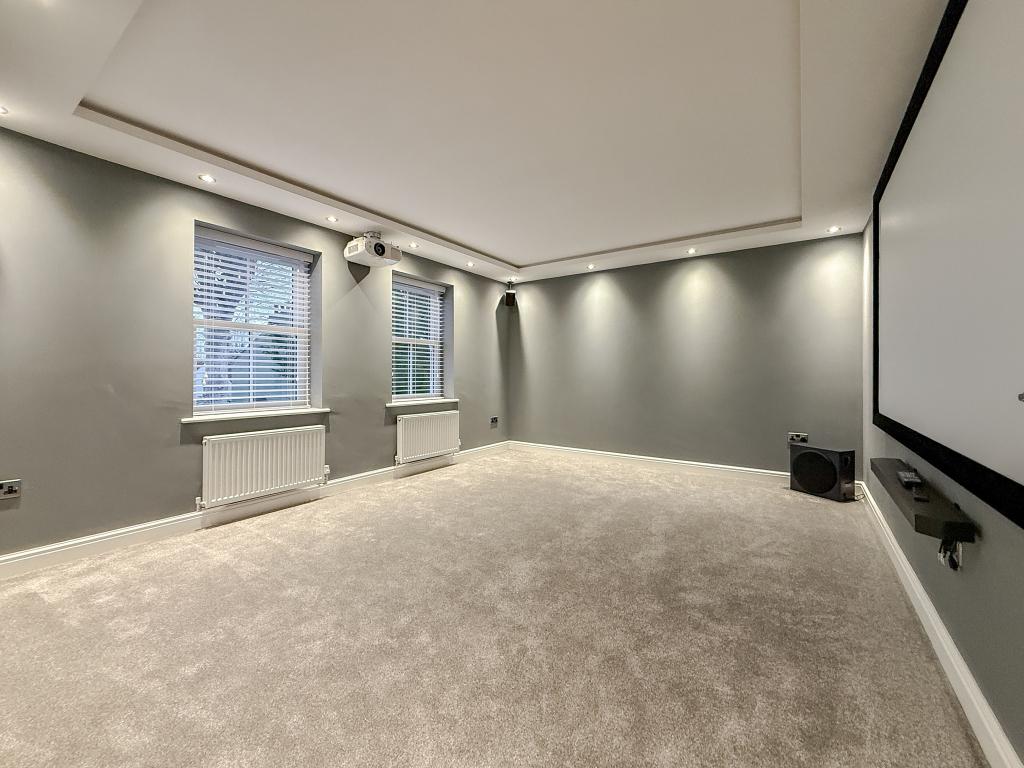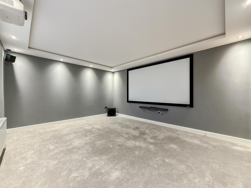 Upstairs, four generous double bedrooms await. Three are served by a stylish four-piece family bathroom. The principal suite benefits from a walk-in wardrobe and a modern en-suite shower room complete with 'his and hers' sink wash hand basins. One bedroom is fitted with an Epsom home cinema system.