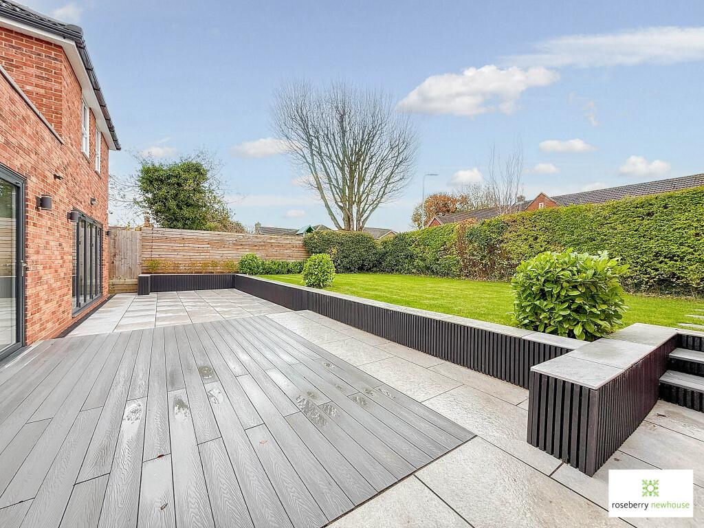 The south-facing rear garden is a standout feature, boasting a spacious porcelain-tiled entertaining terrace with inset composite decking, complemented by manicured lawns to both the front and rear.