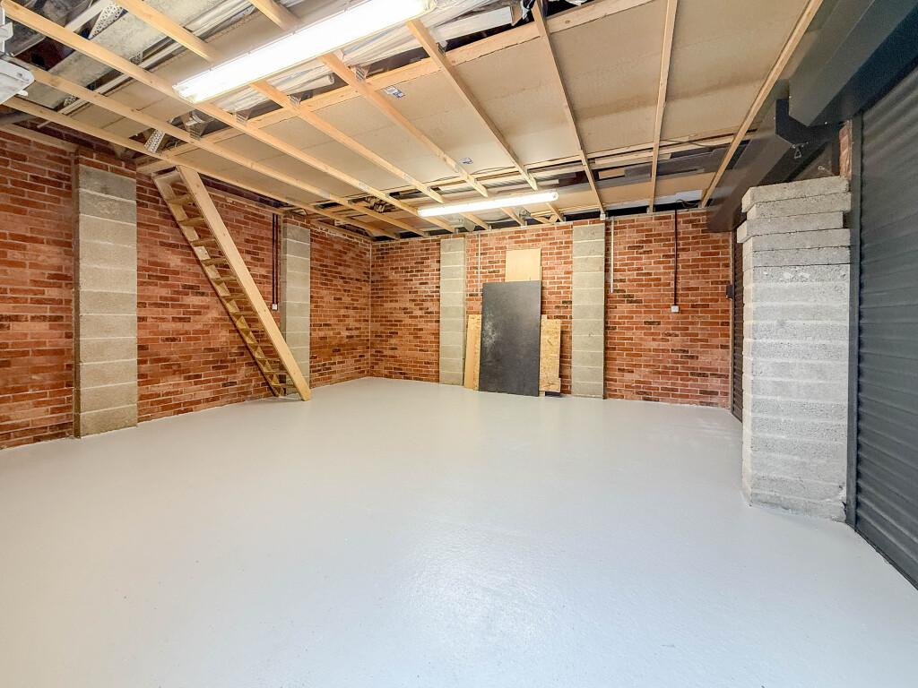 The double garage features oversized electric roller doors, impressive ceiling height, and a staircase leading to a partially boarded storage area with lighting. With mains water, drainage, and electricity in place, it offers exciting potential for conversion or a dedicated workspace.
