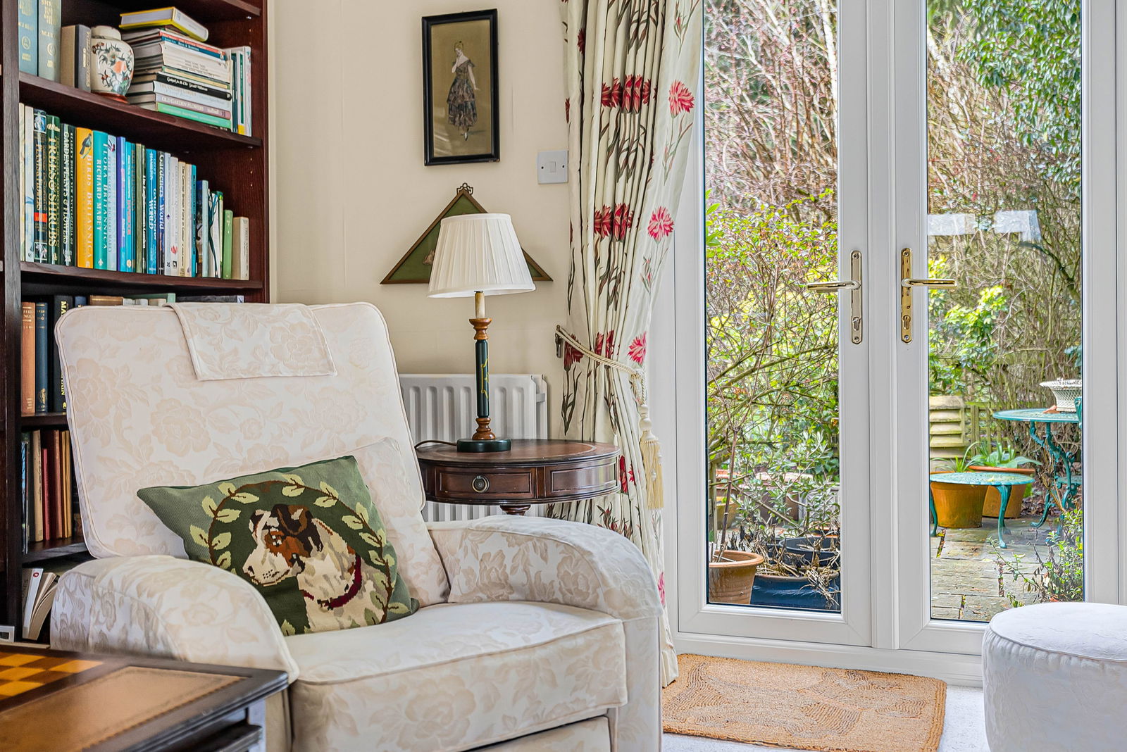 Lovely dual aspect room with double glazed doors opening onto a private courtyard are to the front and matching doors to the rear, giving access to the garden. Attractive fireplace with wood surround housing realistic gas coal fire. Built-in low level cupboards for t.v. Two radiators.