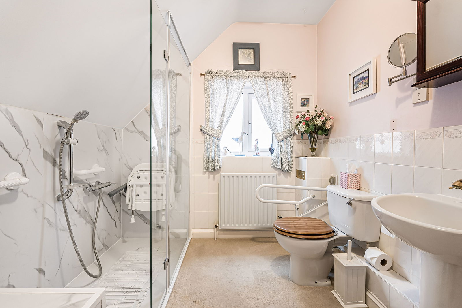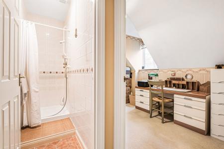 Large walk-in shower area with glazed screen. Low flush w.c. Pedestal wash hand basin. Radiator. Extractor fan. Airing cupboard housing pre-lagged hot water cylinder.