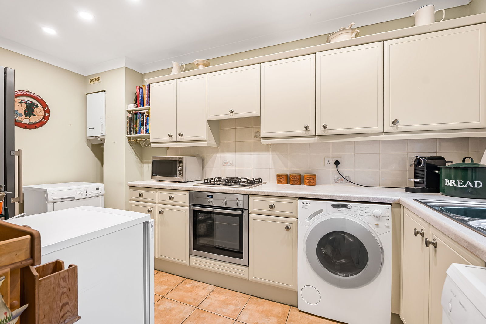 Fitted with a range of wall and base cabinets with complementary work surfaces over. Tiled splash-backs. Inset one and a half bowl sink and drainer. Built-in 'Neff' oven/grill with matching four ring gas hob above. Pull out illuminated extractor fan. Several free standing appliances to remain that include: 'Miele' washing machine, 'Bosch' dishwasher plus under counter freezer and a 'John Lewis' brushed steel larder fridge and tumble dryer. Wall mounted gas fired boiler. Tiled floor. Radiator.