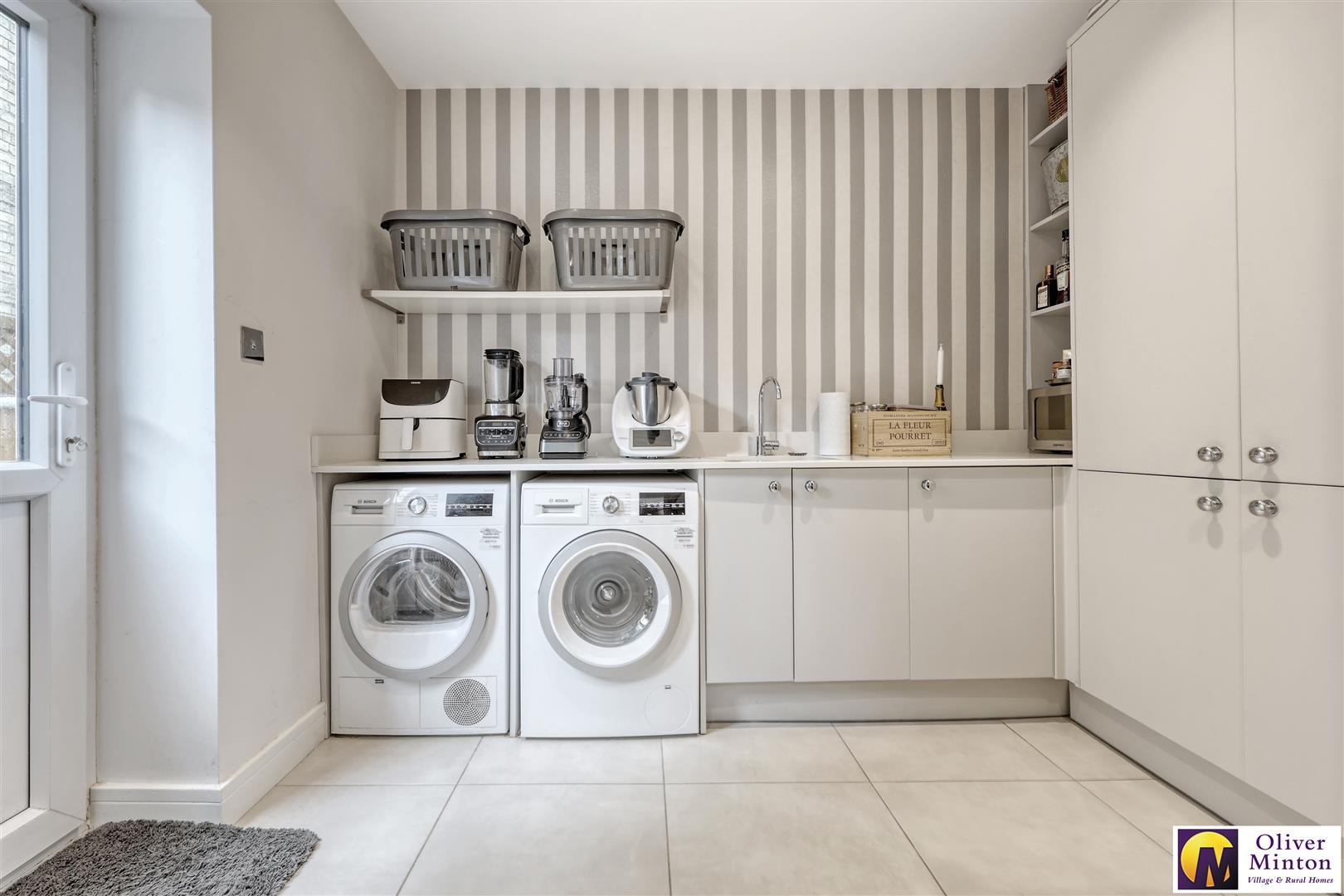 Utility Room - 3.10m x 2.95m (10'2 x 9'8) - uPVC double glazed side door. Ceramic tiled floor with underfloor heating. White quartz work surfaces incorporating sink unit and fitted storage cupboards. Plumbing for washing machine and space for tumble dryer.