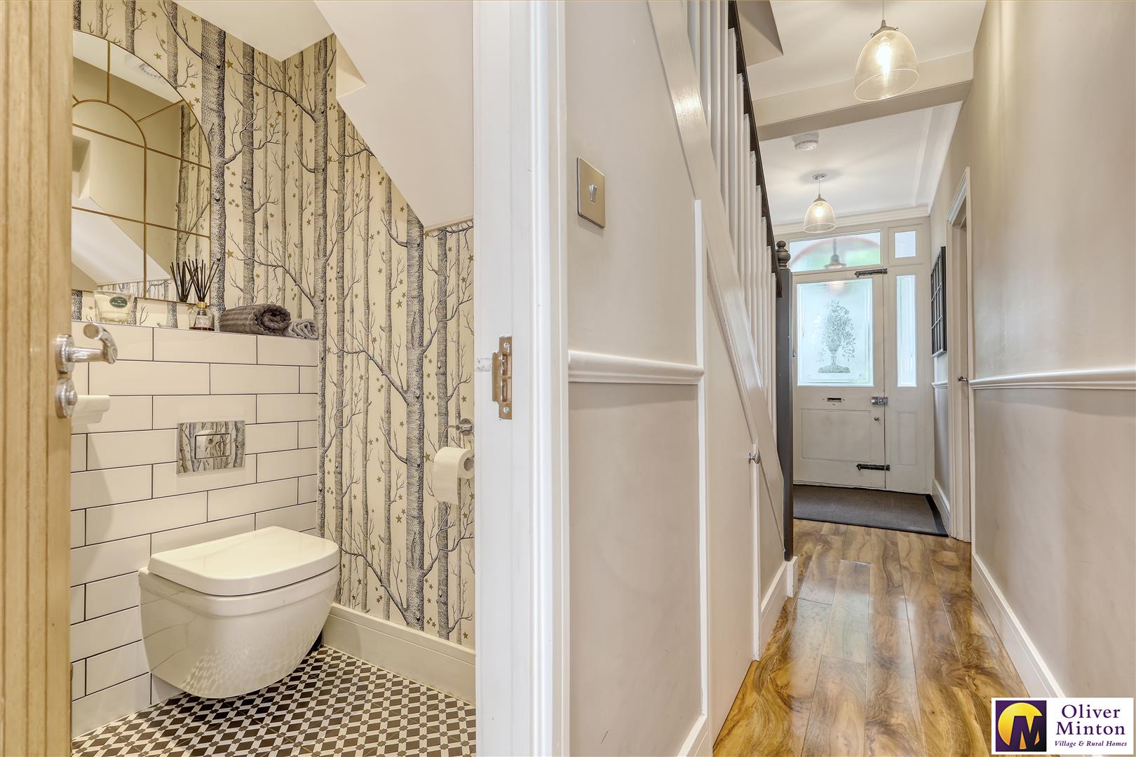 Cloakroom - Attractive white suite comprising 'Grohe' WC, corner wash hand basin. Ceramic tiled floor with underfloor heating. Extractor fan.