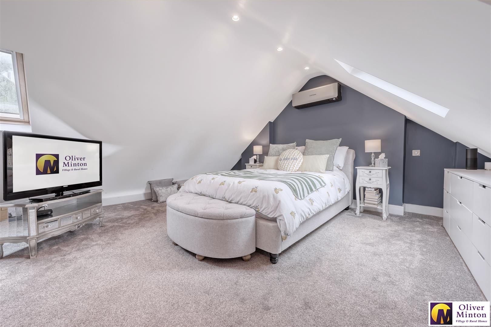 Second Floor Master Bedroom - 5.66m x 5.59m at floor level + 3.23m x 3.18m dress - Sloping roof eaves. 2 double glazed 'Velux' windows. Wall-mounted air conditioning unit. 2 antique style radiators. Built-in eaves storage cupboards. Inset ceiling lights. Door to: