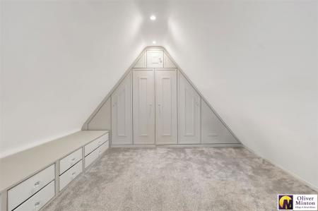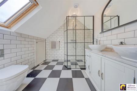 Wet room style shower with glazed screen. Twin wash hand basins with marble surround, storage cupboard and drawers below. Ceramic tiled floor. Double glazed 'Velux' window. Heated towel rail. Eaves storage cupboard. Shaver socket. Extractor fan. Inset ceiling lights.