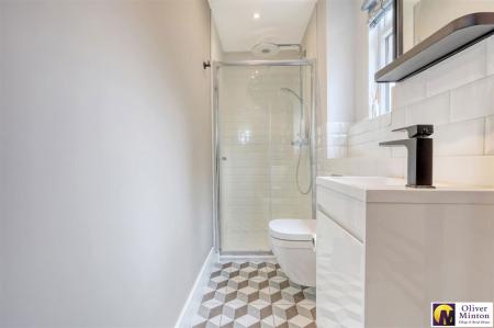 Large glazed shower cubicle, WC and wash hand basin with cupboard under. Heated towel rail. Ceramic tiled floor. uPVC double glazed obscure window to side. Extractor fan. Inset ceiling lights.