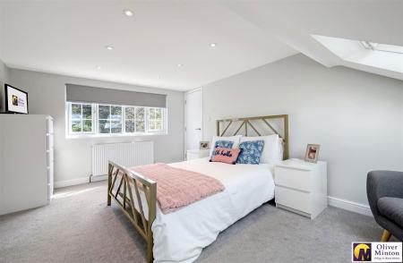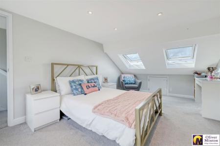 A lovely bright dual aspect room with two double glazed skylight windows to front and double glazed windows to rear. Radiator. Inset ceiling lights. Eaves storage cupboards. Door to WALK-IN WARDROBE with inset ceiling lights. Door to:
