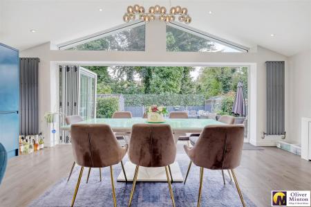 A wonderful family and entertaining room. Rear dining area with vaulted ceiling and full width uPVC double glazed bi-fold doors to rear garden. Excellent range of fitted wall, base and drawer units with white quartz granite work surfaces incorporating sink unit. Matching island work surface and breakfast bar with inset AEG induction hob. Built-in electric Neff double ovens. Integrated dishwasher. Pull-out larder unit. Recess and plumbing for large fridge/freezer. uPVC double glazed window to side from Lounge area. Three vertical panel windows. Door to understairs storage cupboard. Inset ceiling lights. Part glazed door to: